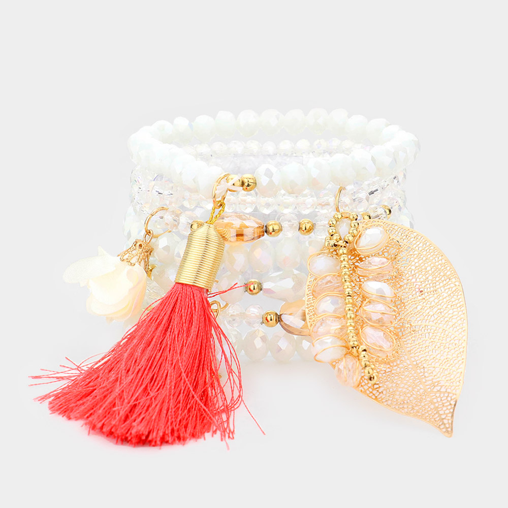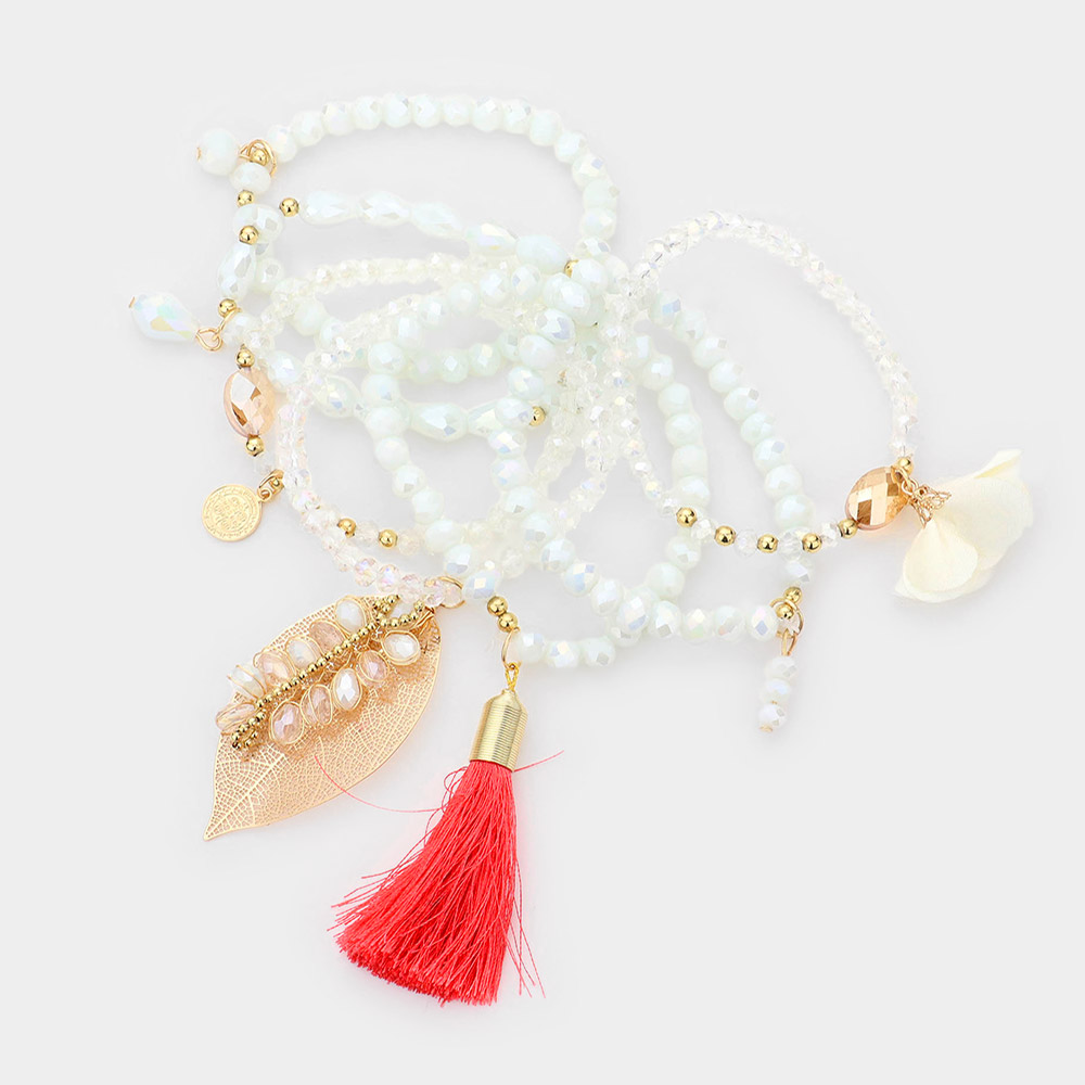7pcs - Leaf Fabric Flower Coin Tassel Charm Faceted Beaded Stretch Bracelets
