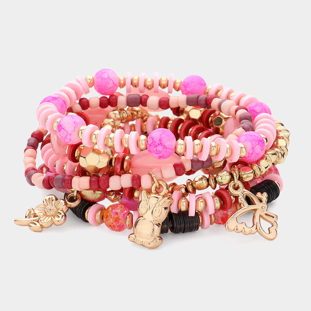 7PCS - Metal Flower Angel Dolphin Owl Charm Faceted Beaded Stretch Multi Layered Bracelets