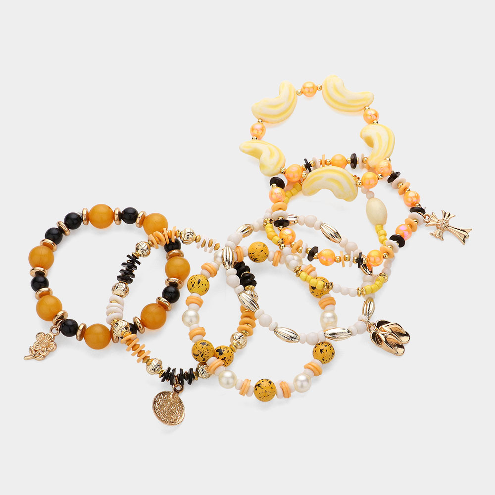 7PCS - Metal Flower Disc Flip Flop Cross Charm Pointed Various Beaded Stretch Multi Layered Bracelets