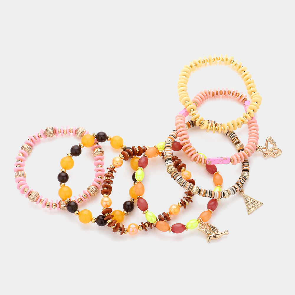 7PCS - Metal Pigeon Triangle Charm Pointed Various Beads Beaded Stretch Multi Layered Bracelet