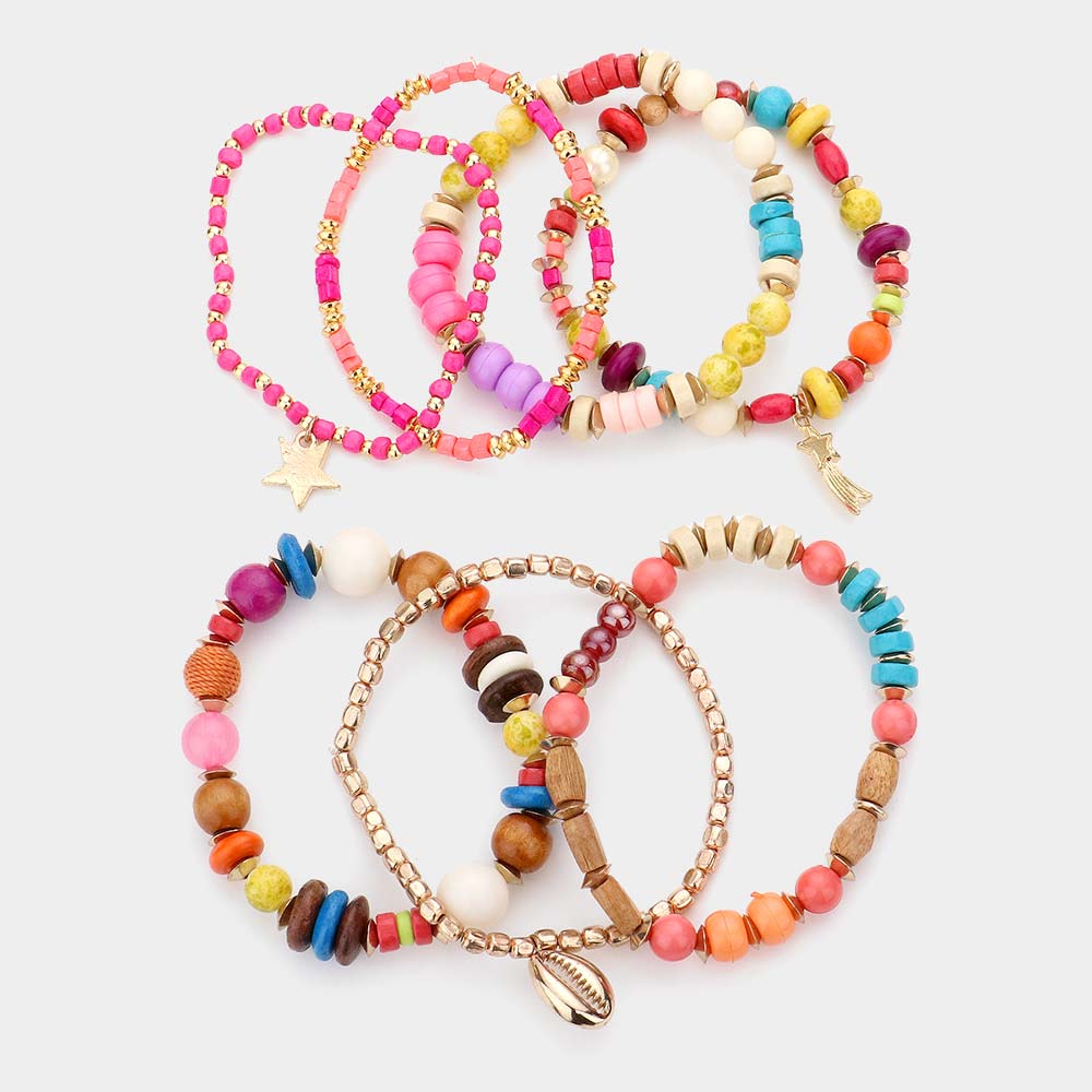 7PCS - Metal Star Puka Shell Charm Wood Beaded Stretch Bracelets