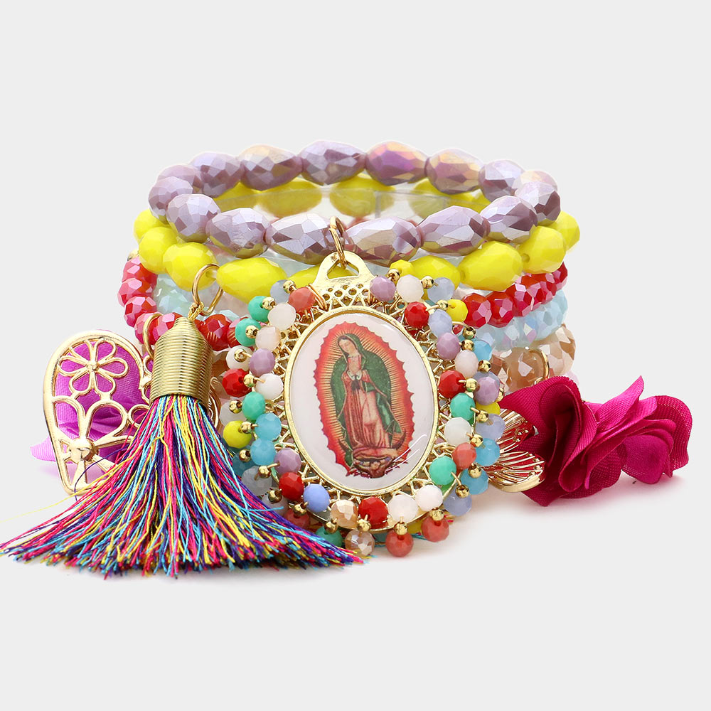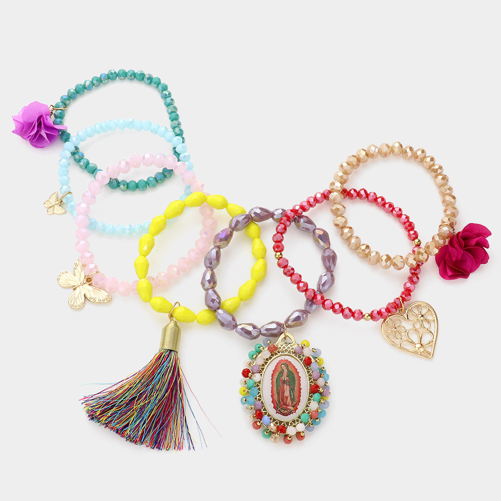 7PCS - Mother Maria Flower Heart Butterfly Tassel Charm Faceted Beaded Stretch Bracelets