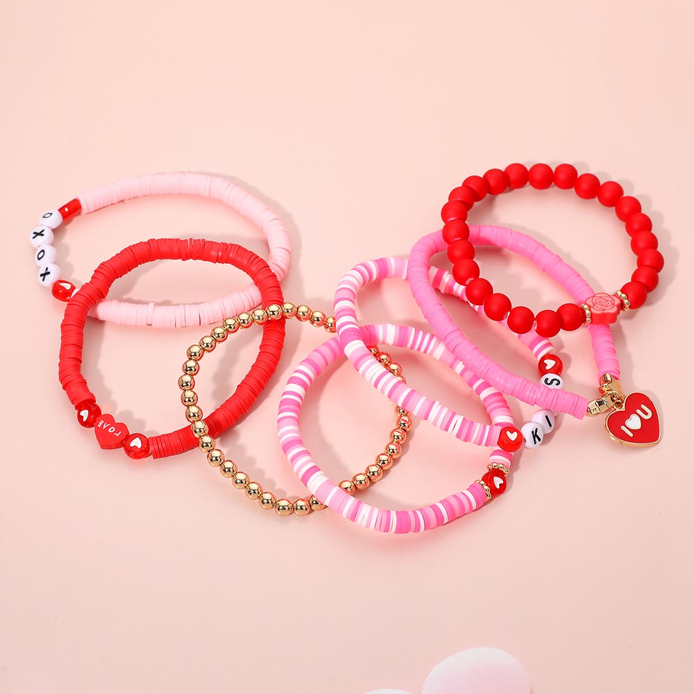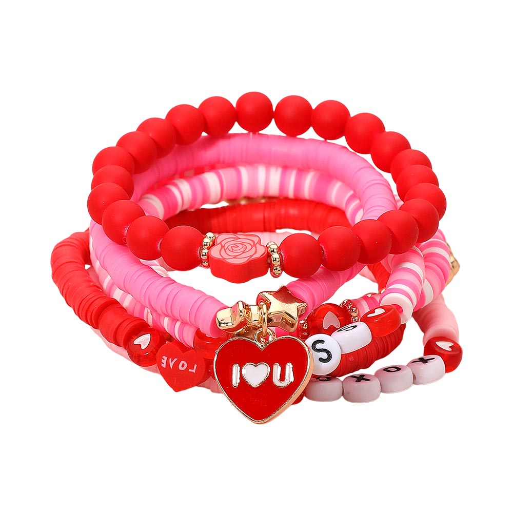 Details • Size : 1.7" H • Stretchable • Playful stretch bracelet set featuring mixed beads, heart charms, letter accents and a layered stack design. Includes multiple coordinated strands with themed details for gifting, everyday wear or festive styling. A fun accessory set that adds personality and charm to any look. • Lead and Nickel Compliant