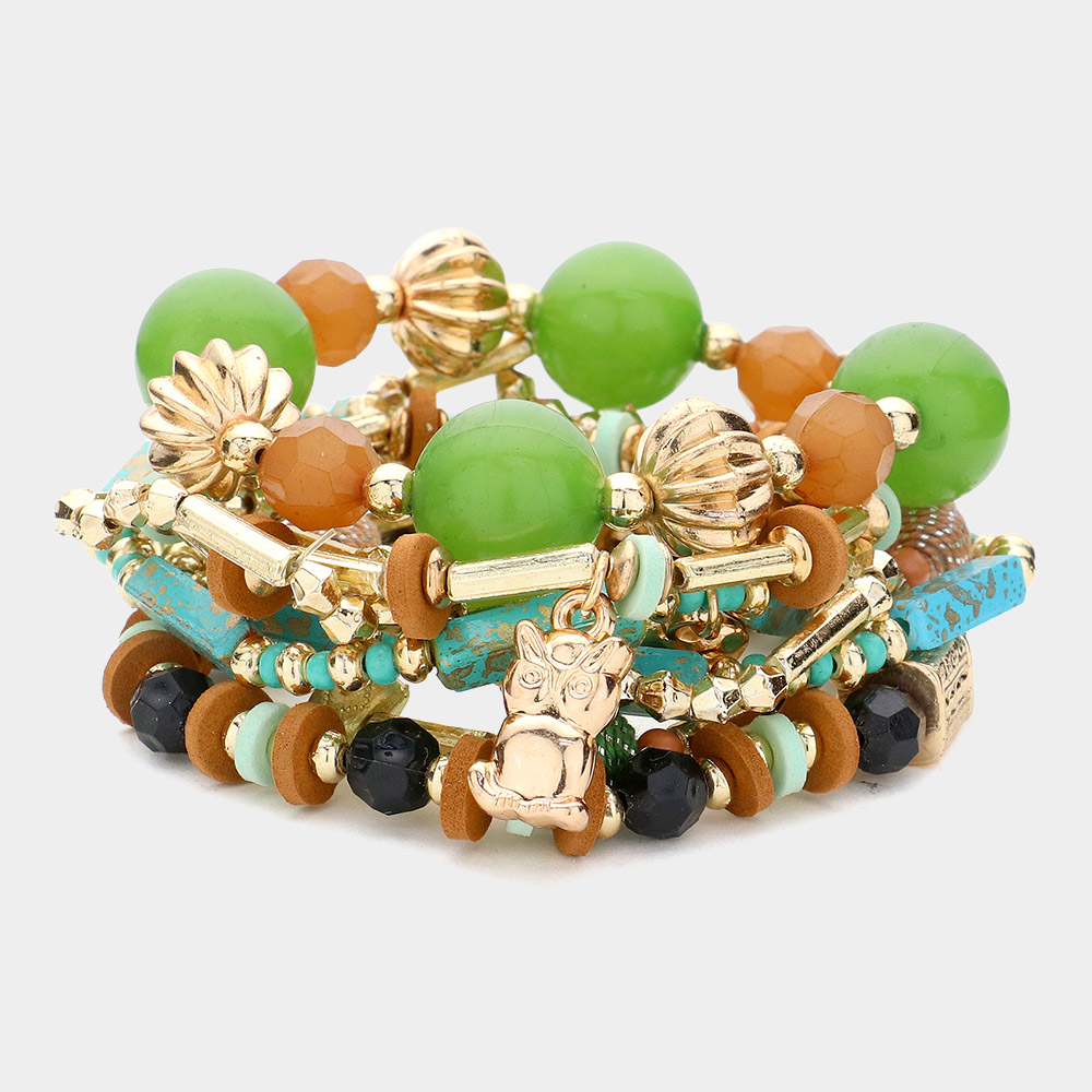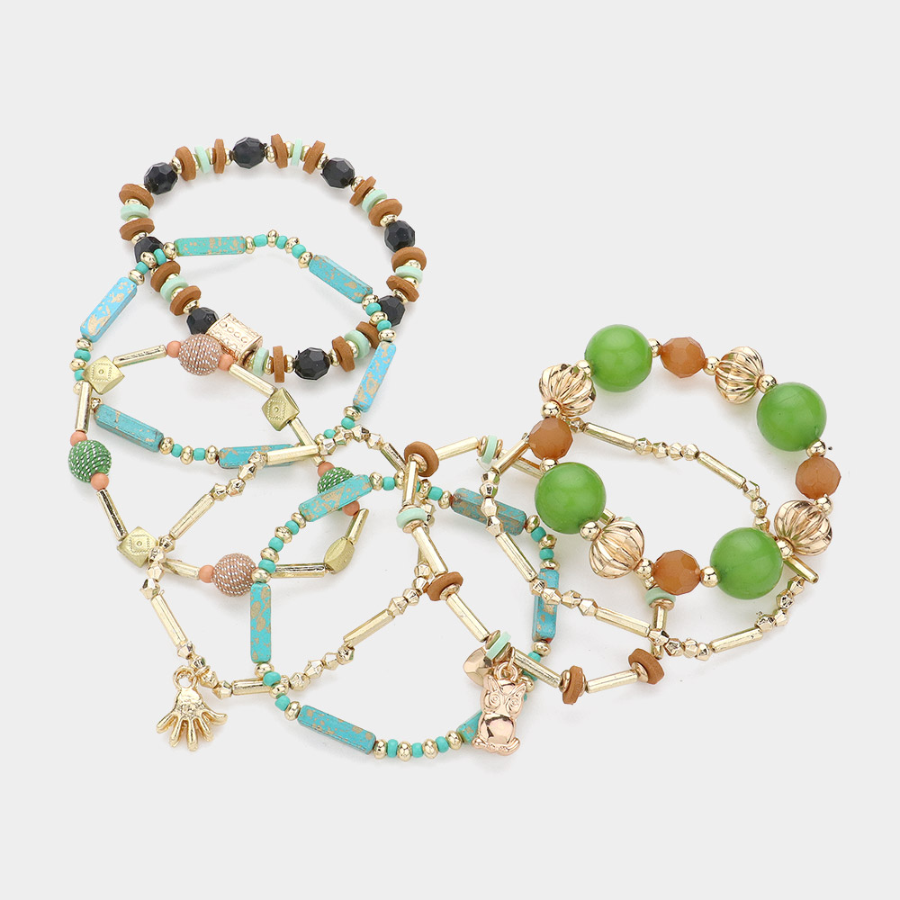 8PCS - Metal Owl Hand Charm Multi Beads Stretch Layered Bracelets