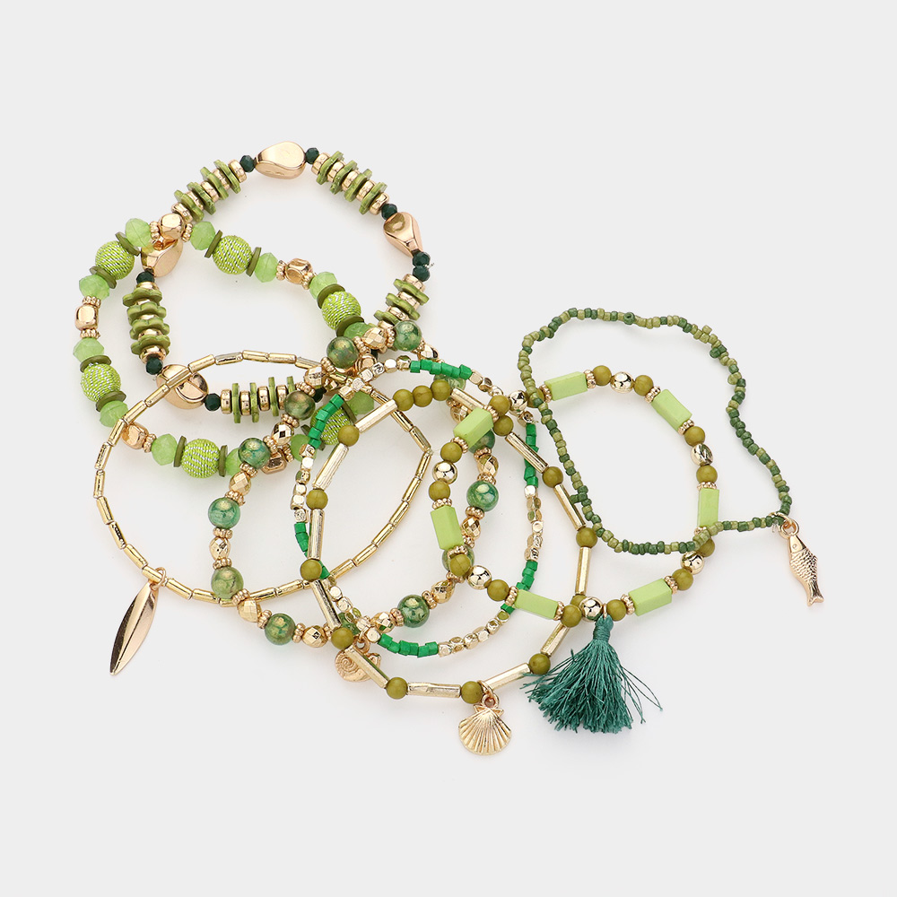 8PCS - Metal Shell Fish Tassel Charm Multi Beads Layered Bracelets