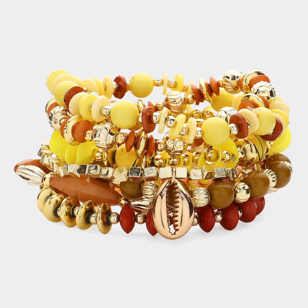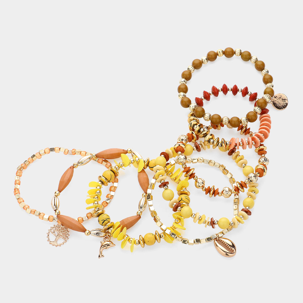 8PCS - Metal Tree Of Life Dolphin Puka Shell Charm Pointed Various Beads Beaded Stretch Multi Layered Bracelets