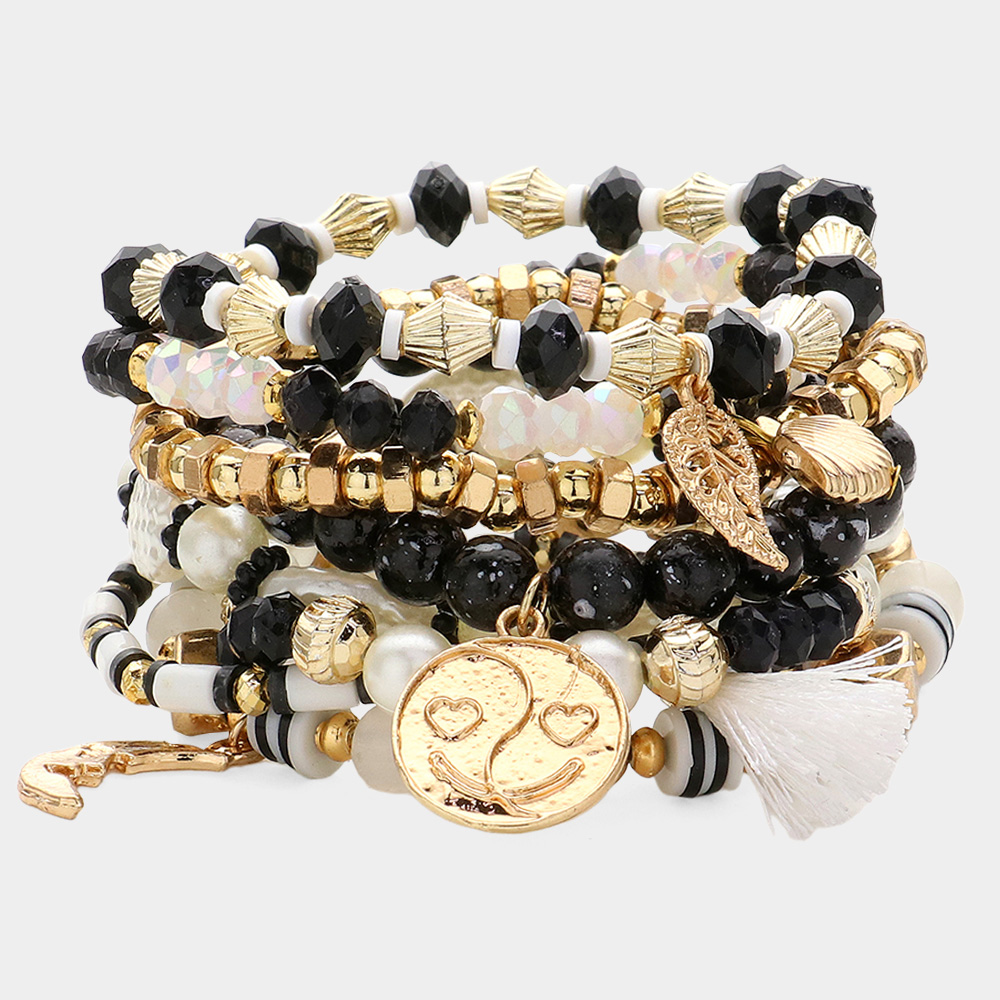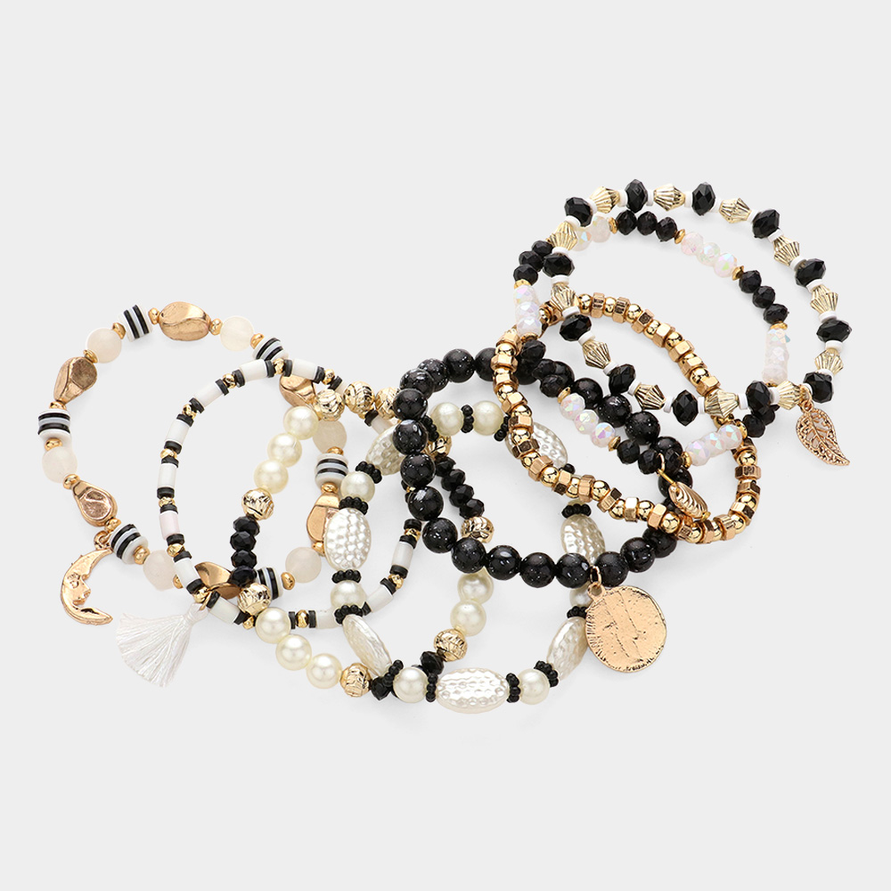 8PCS - Pearl Beaded Crescent Tassel Metal Leaf Disc Charm Stretch Multi Layered Bracelets