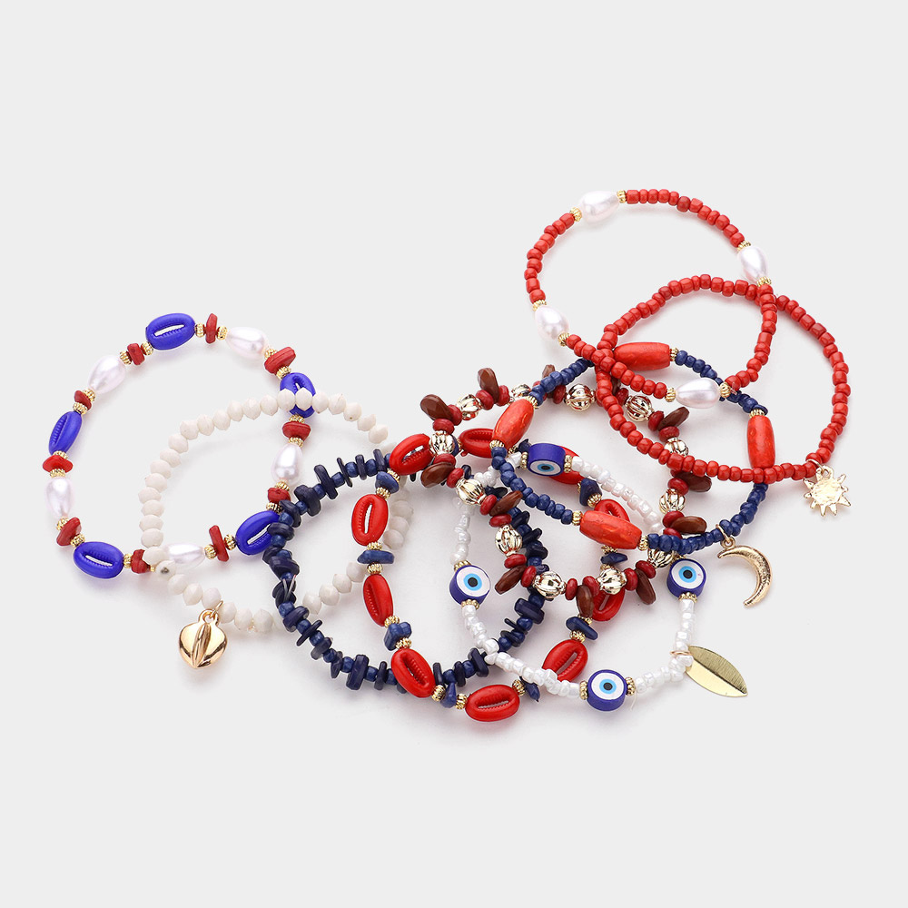 9PCS - Metal Moon Sun Shell Charm Evil Eye Pointed Various Beads Beaded Stretch Multi Layered Bracelet