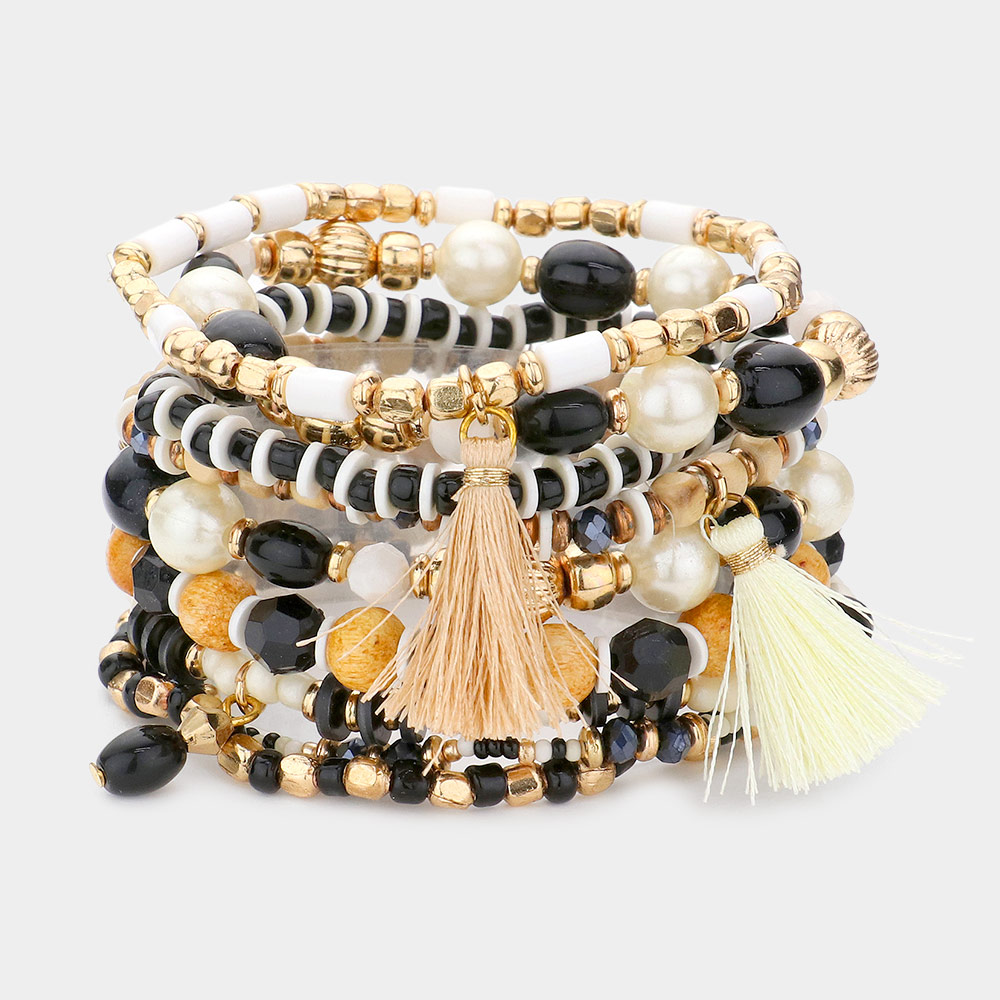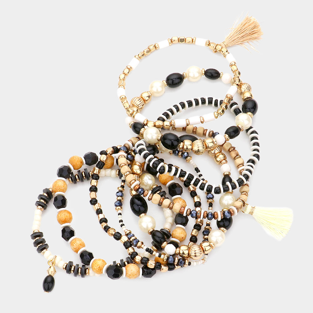 9PCS - Tassel Charm Wood Beaded Stretch Bracelets