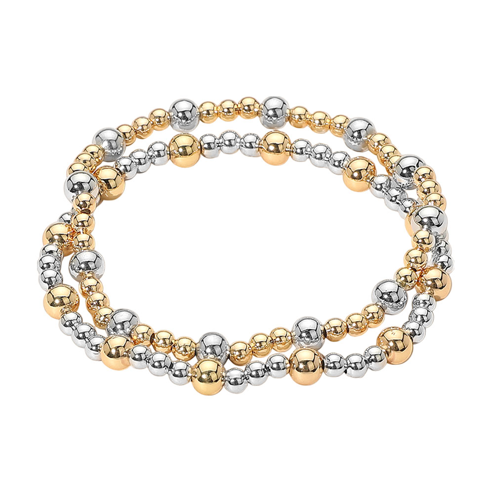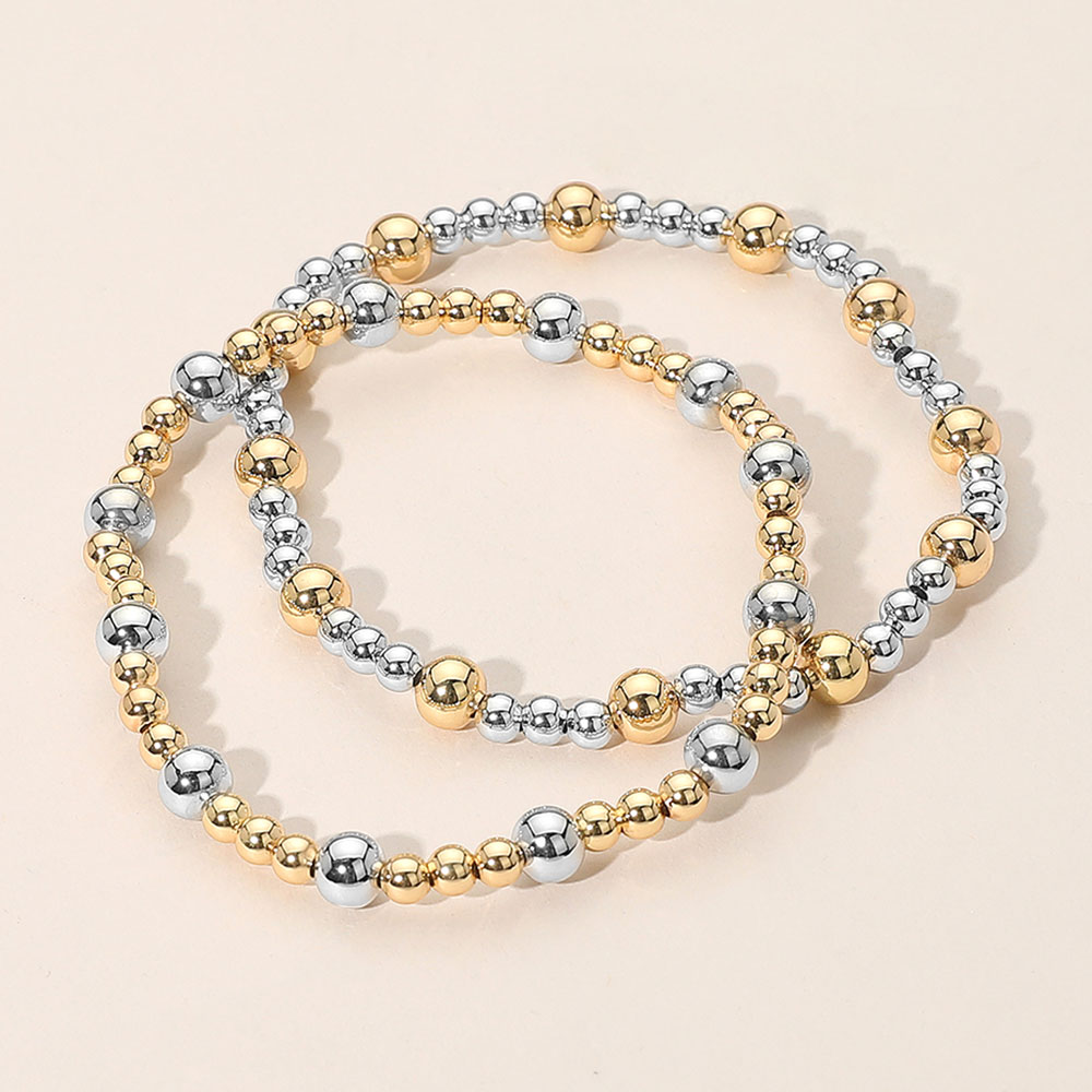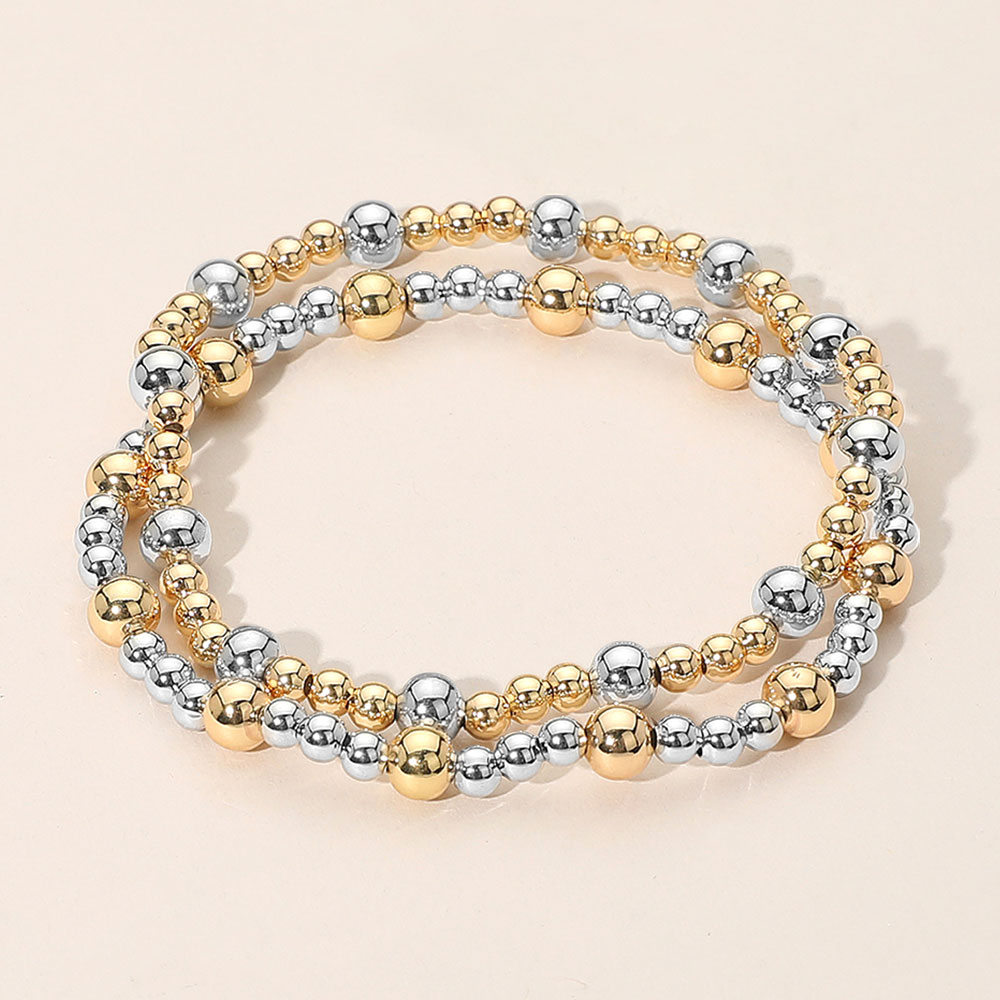 • Elegant two-piece beaded bracelet set featuring a mix of polished metallic beads. Stretchable design for comfort and versatility. Ideal for layering or wearing individually for a chic, modern look.