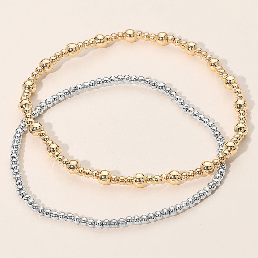 Details • Size : 0.25" H • Stretchable • Elegant beaded stretch bracelet set with smooth, polished finish. Lightweight and versatile for casual or dressy outfits. Perfect for layering or wearing solo. • Brass