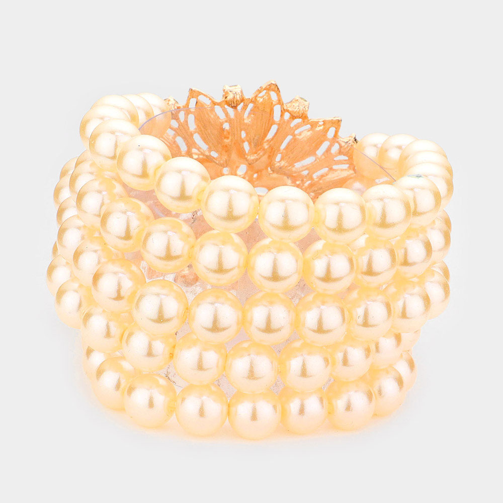 Details • Size : 2.1" H • Stretchable • Elegant pearl stretch bracelet adorned with a dazzling crystal floral centerpiece that sparkles beautifully. Designed for comfort and sophistication, this bracelet is perfect for weddings, parties, or special occasions, adding a timeless touch of glamour to any ensemble.