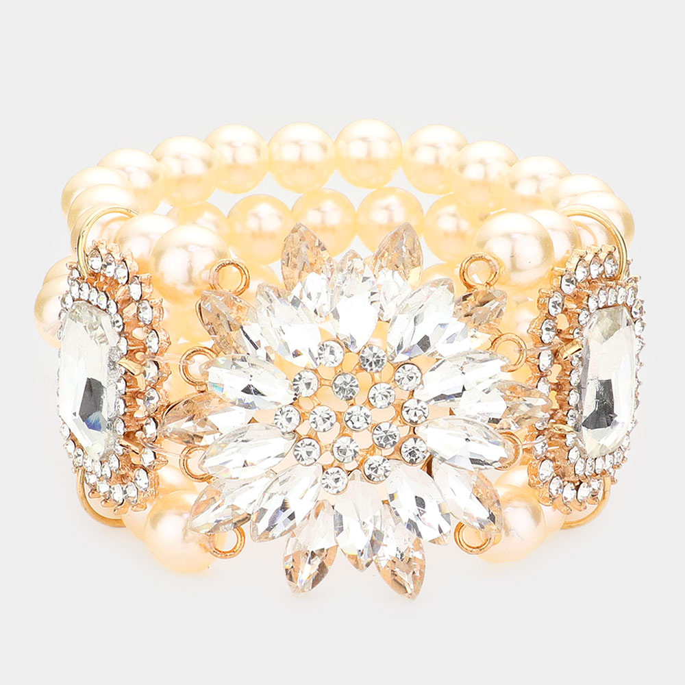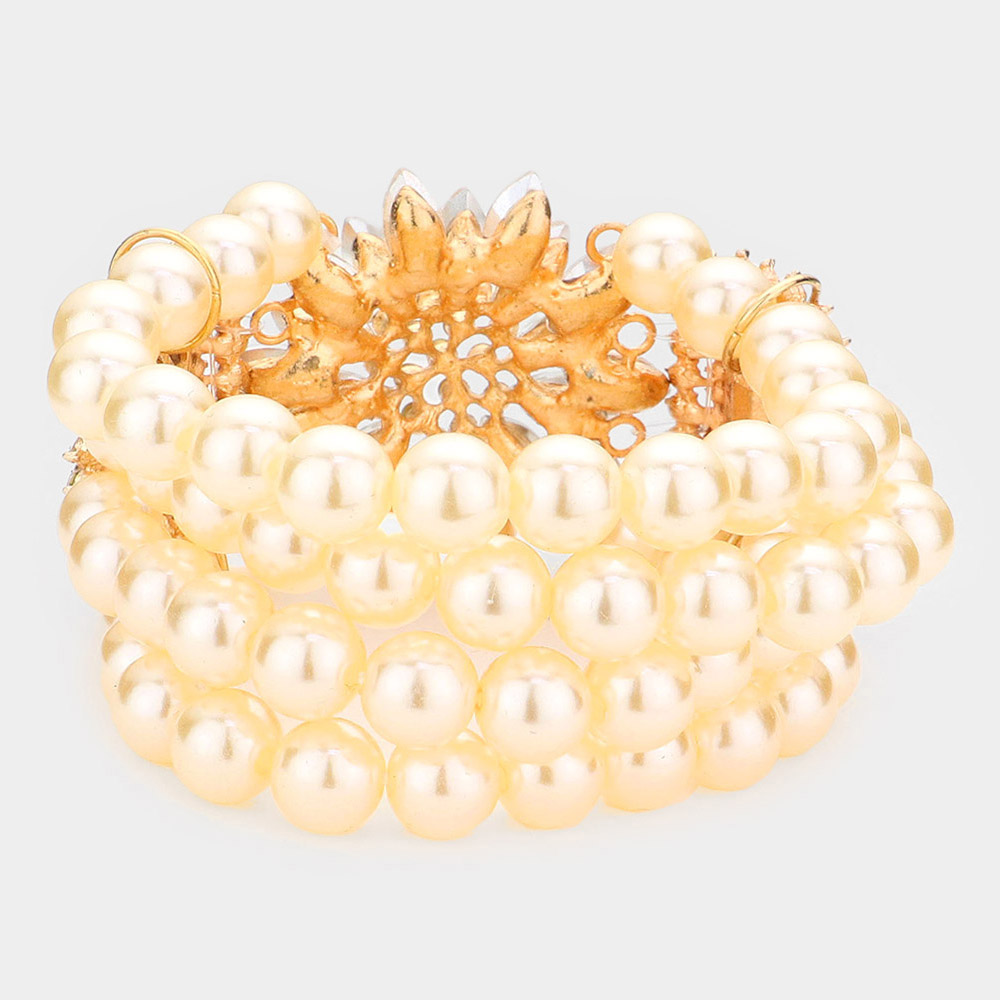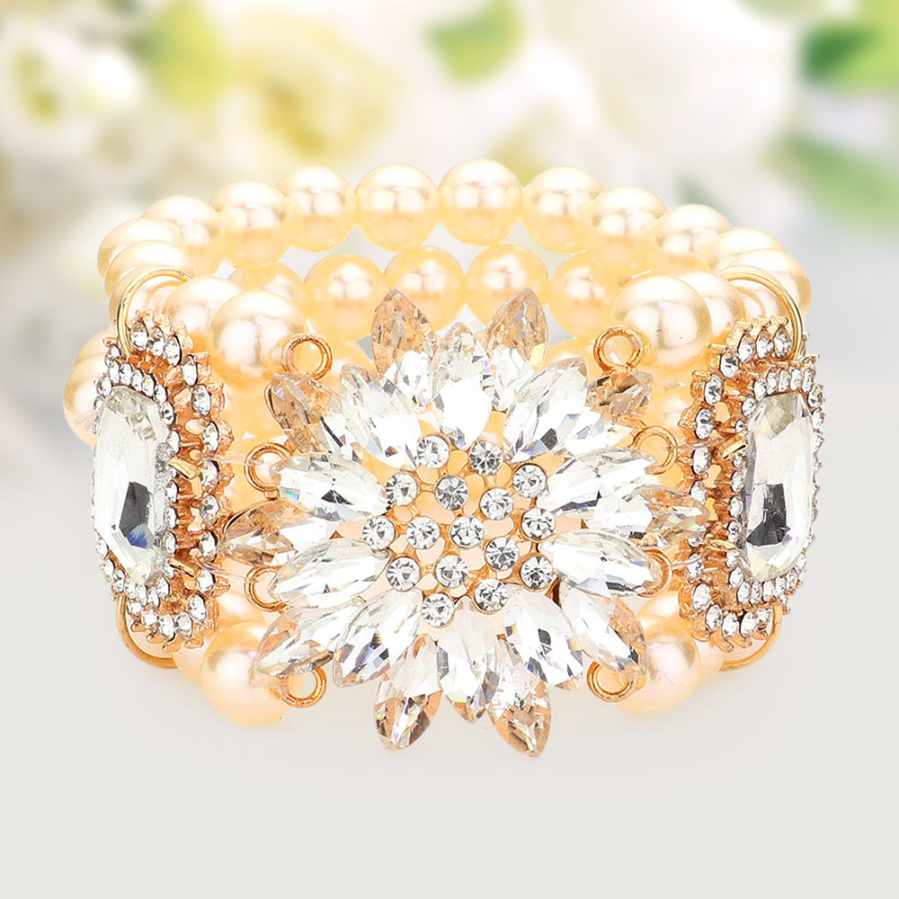 Details • Size : 1.75" H • Stretchable • Luxurious pearl stretch bracelet featuring a radiant floral centerpiece and sparkling crystal side accents. A sophisticated accessory designed for weddings, formal events, or special occasions, offering timeless elegance and a touch of refined glamour to elevate any outfit.