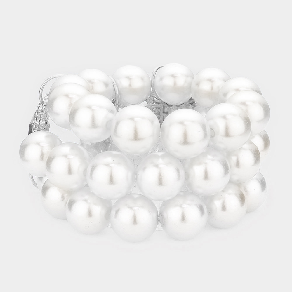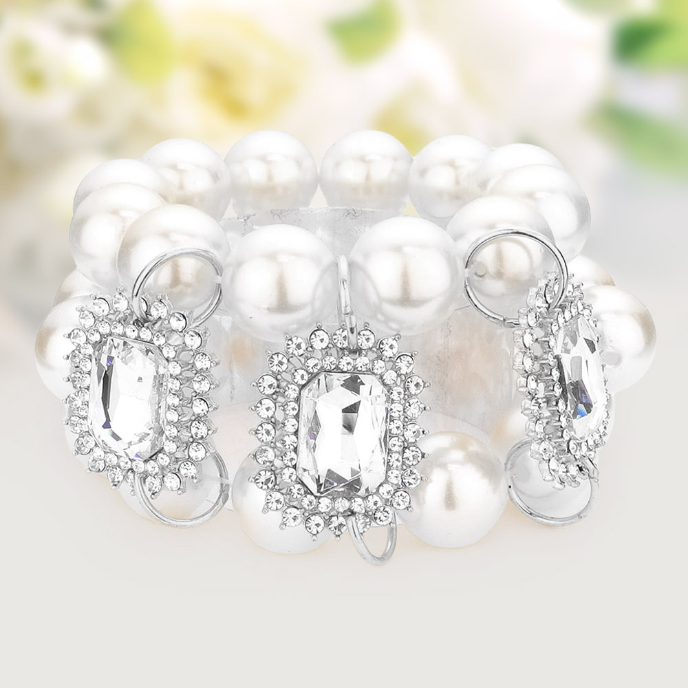 • Chic pearl stretch bracelet adorned with sparkling crystal-framed accents for a sophisticated look. Perfect for weddings, parties, and formal events, this timeless bracelet combines elegance and comfort, making it a stunning addition to bridal or evening jewelry collections.