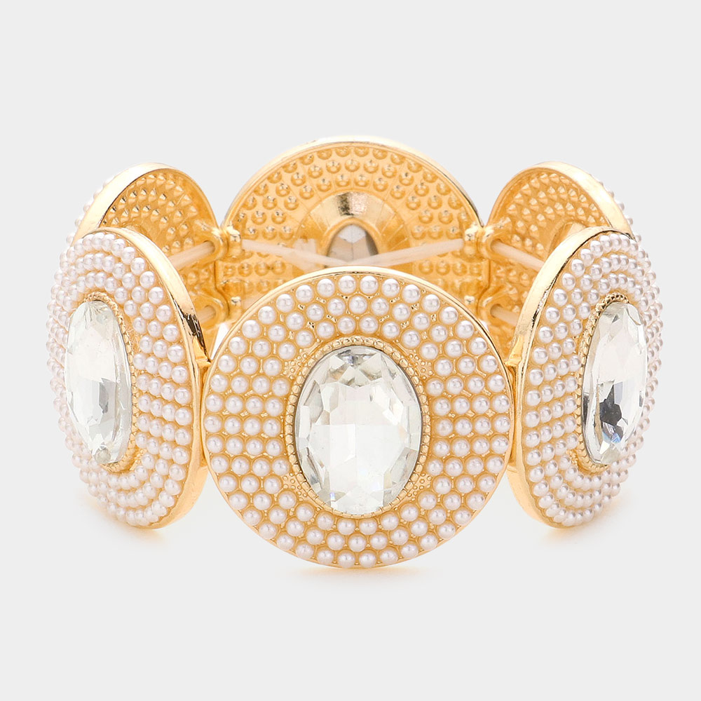 Oval Stone Centered Pearl Cluster Stretch Bracelet