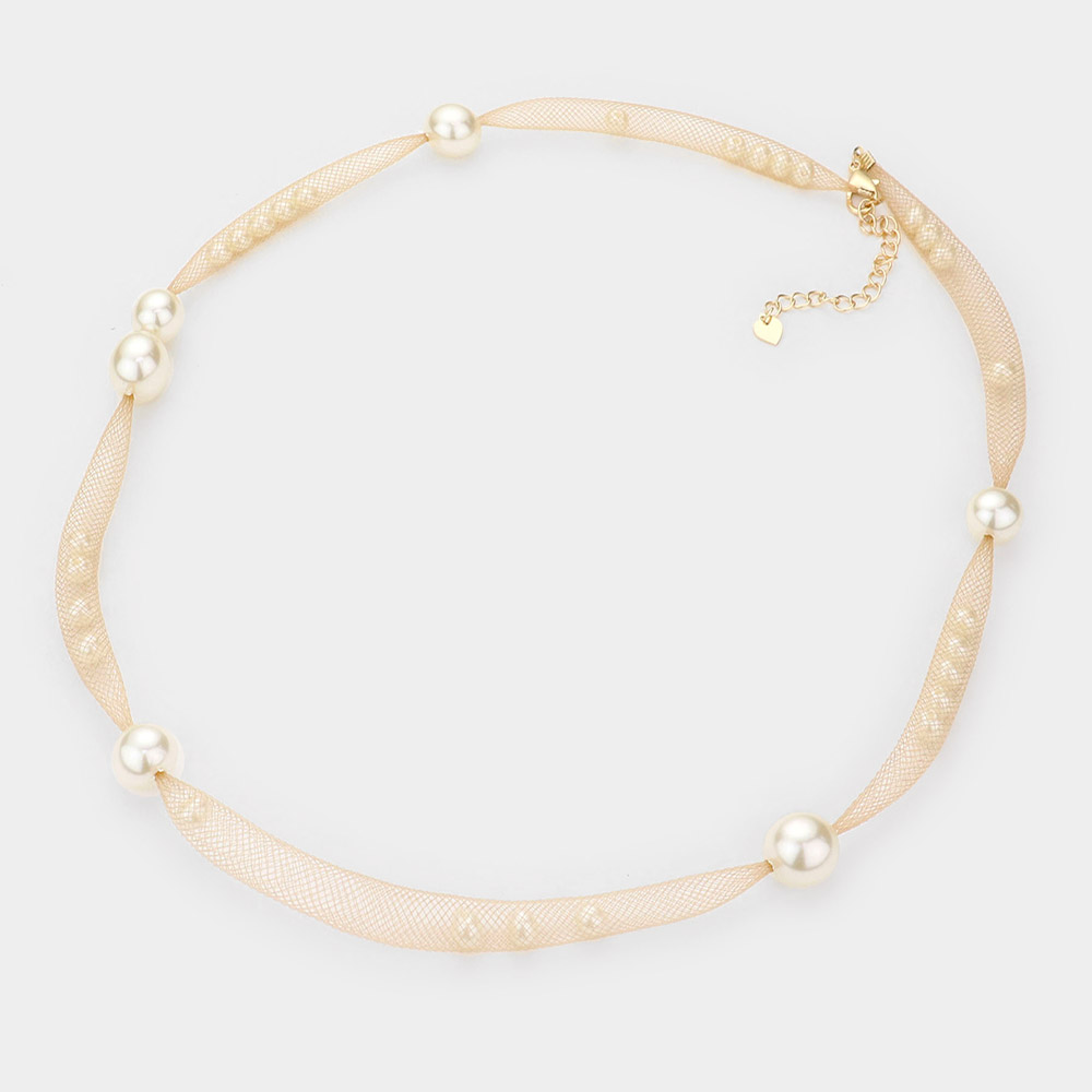 Pearl Accented Triple Layered Mesh Bib Necklace