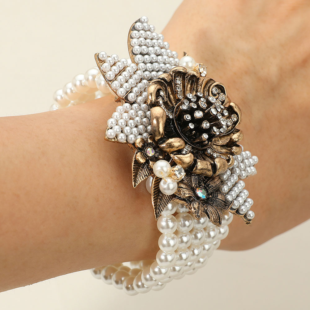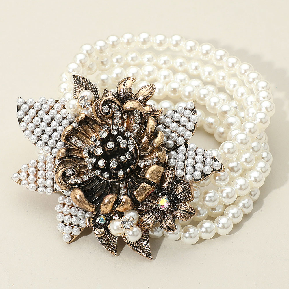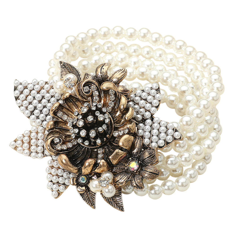Details • Size : 2.25" H • Stretchable • Elegant stretch bracelet designed with layered pearl strands and an ornate floral centerpiece adorned with crystals. A perfect statement piece for weddings, parties, or evening wear, this bracelet blends vintage-inspired charm with timeless sophistication for standout bridal or formal style. • Lead and Nickel Compliant