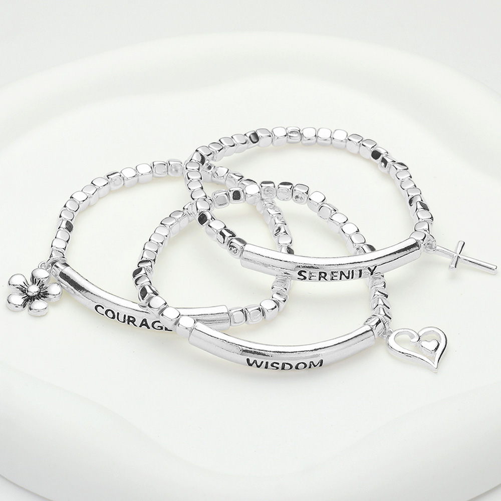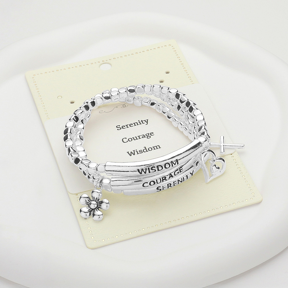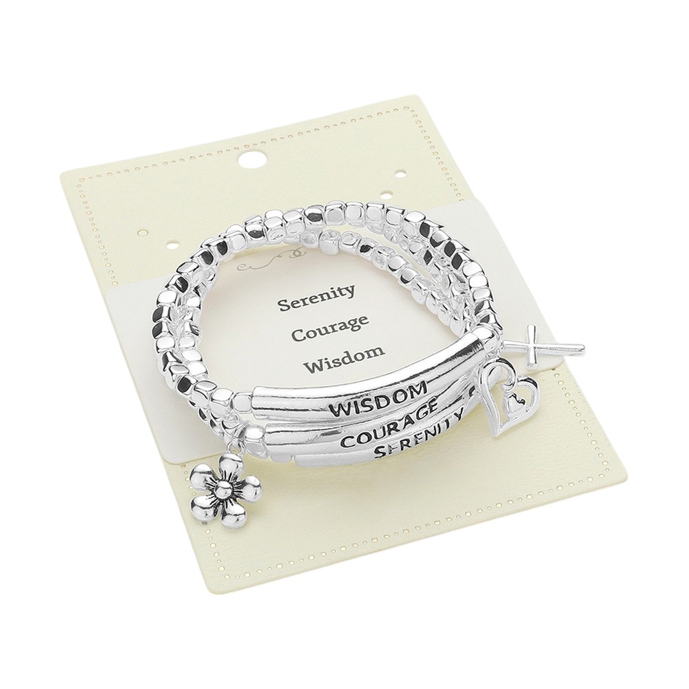 Details • Size : 0.75" H • Charm Size : 0.8" L • Stretchable • Find daily encouragement with this wrap bracelet engraved with the words “Serenity, Courage, Wisdom.” Accented with cross, heart, and flower charms, it’s a meaningful faith accessory perfect for personal inspiration or as a thoughtful Christian gift for loved ones on special occasions. • Lead and Nickel Compliant