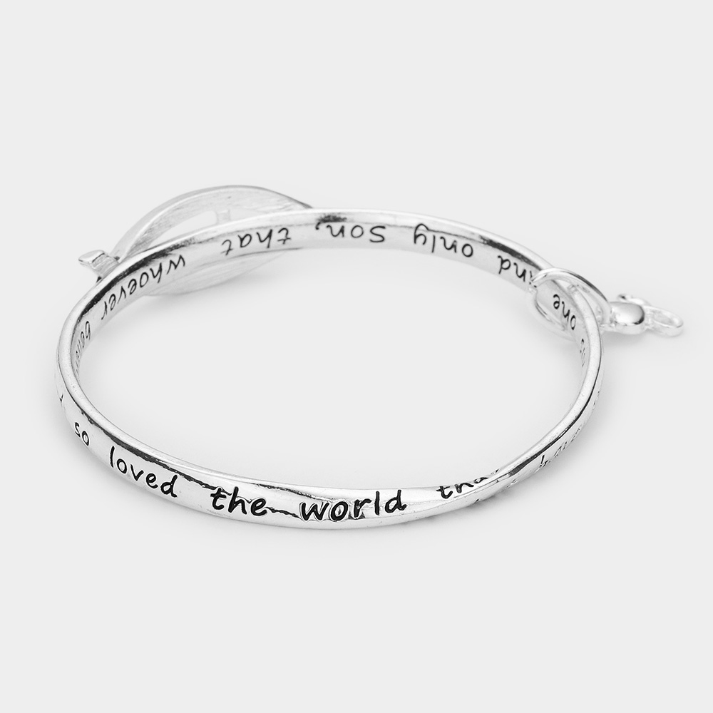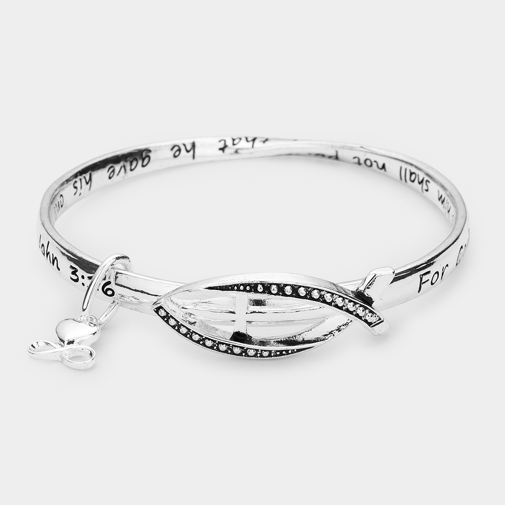 John 3:16 Metal Ichthys Cross Accented Heart Charm Message Bangle Bracelet