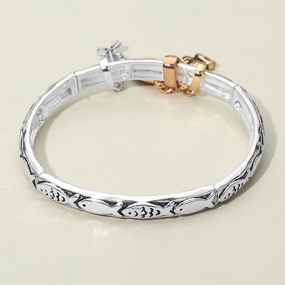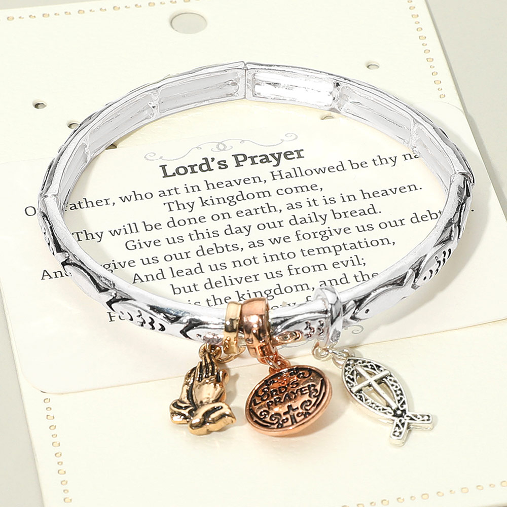 Details • Size : 0.25" H • Charm Size : 1" L • Stretchable • Elegant Lord’s Prayer charm bracelet featuring praying hands, an inscribed medallion, and a symbolic fish charm. A meaningful accessory designed to inspire faith and devotion, perfect for daily wear or gifting. • Lead and Nickel Compliant