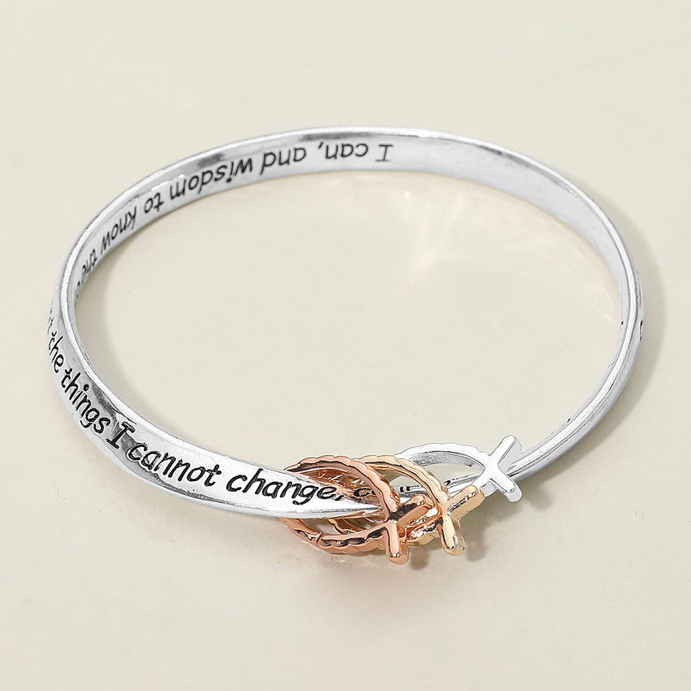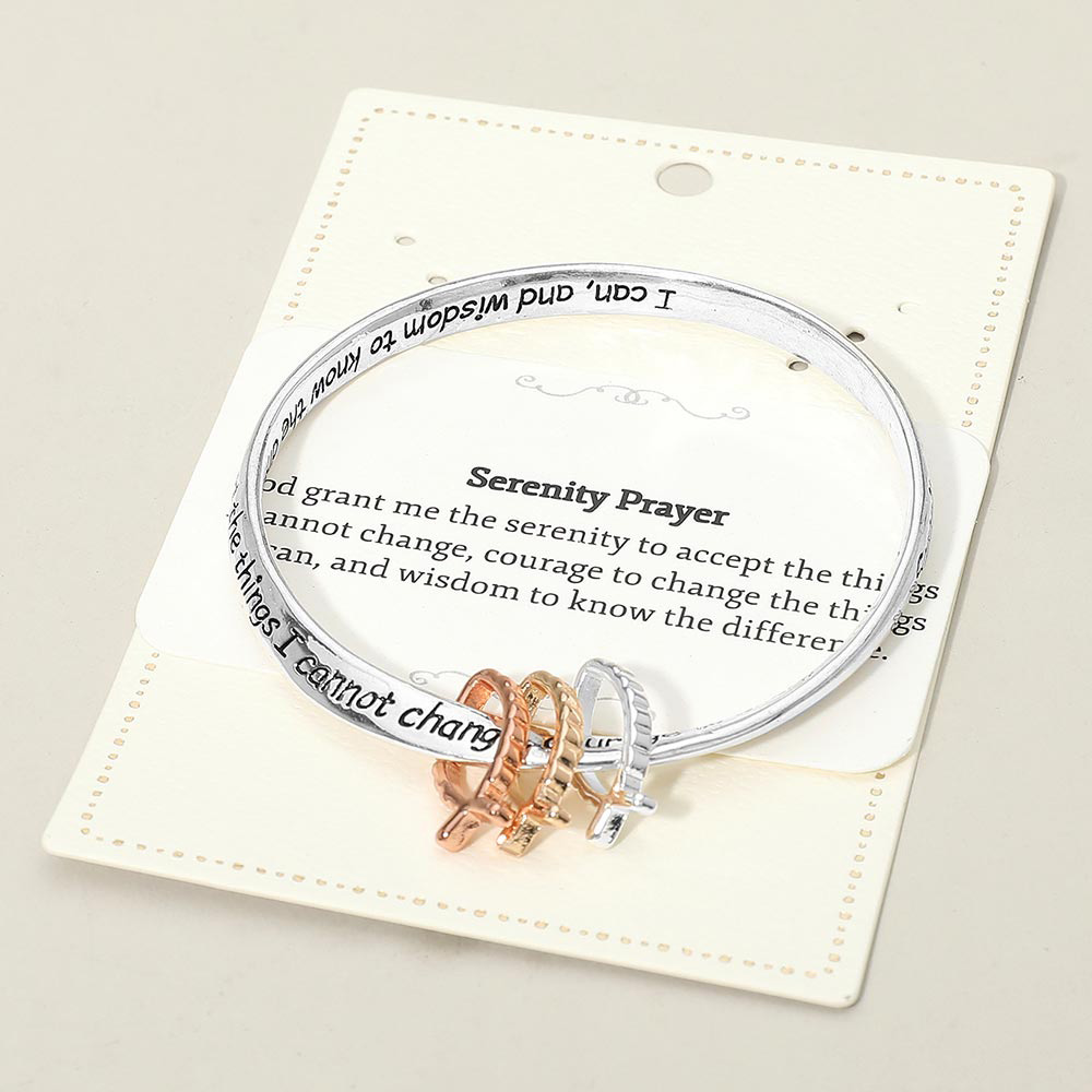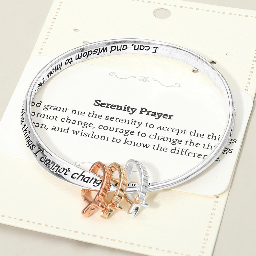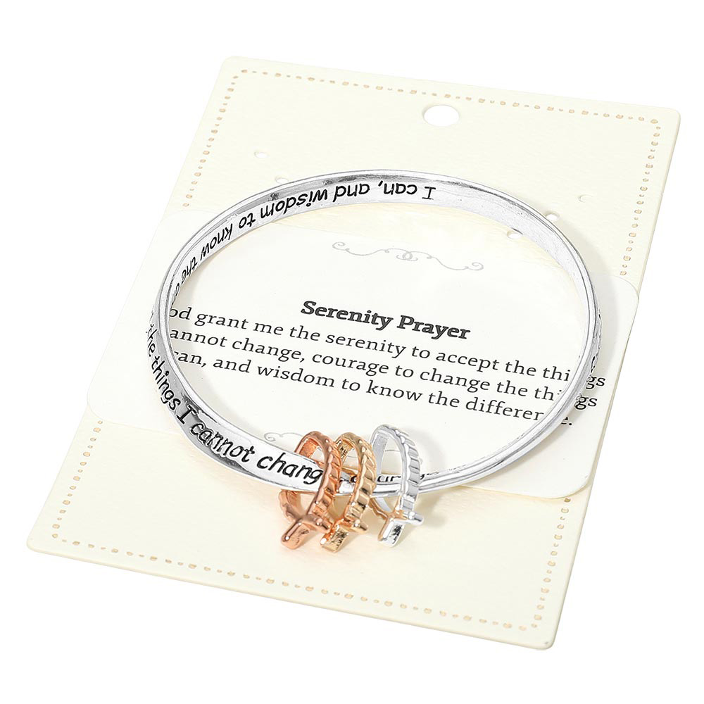 Details • Size : 0.75" H, 2.5" D • Find daily strength and calm with this engraved Serenity Prayer bangle bracelet, featuring an inspiring message with delicate accent rings. A meaningful accessory for everyday wear or thoughtful gifting, offering a stylish reminder of faith, courage, wisdom, and hope. • Lead and Nickel Compliant