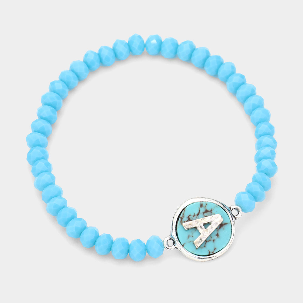 -A- Initial Monogram Turquoise Charm Faceted Beaded Stretch Bracelet
