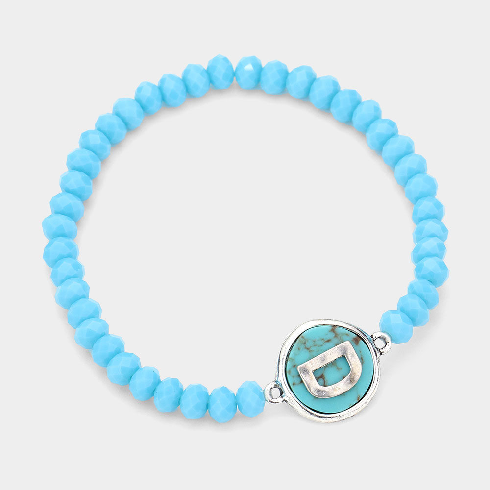 -D- Initial Monogram Turquoise Charm Faceted Beaded Stretch Bracelet