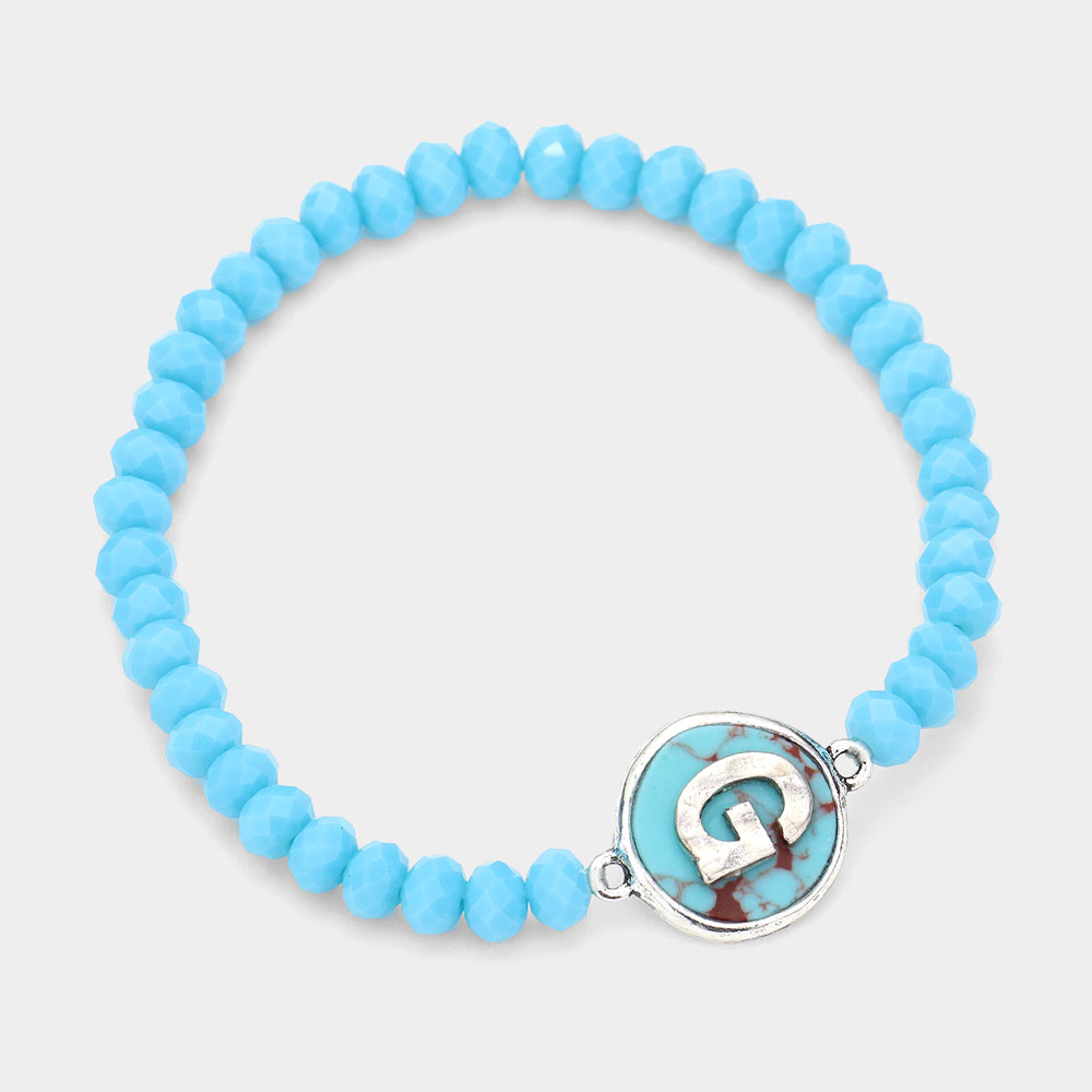 -G- Initial Monogram Turquoise Charm Faceted Beaded Stretch Bracelet