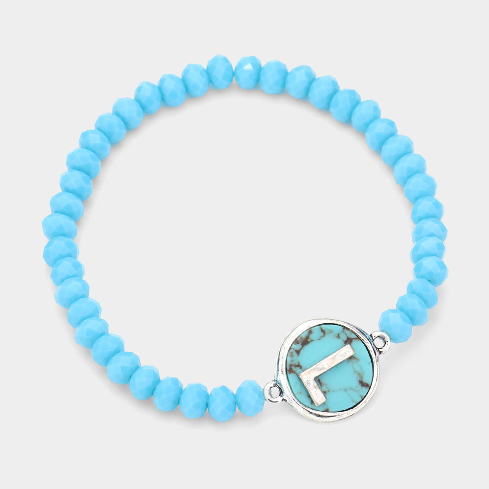 -L- Initial Monogram Turquoise Charm Faceted Beaded Stretch Bracelet
