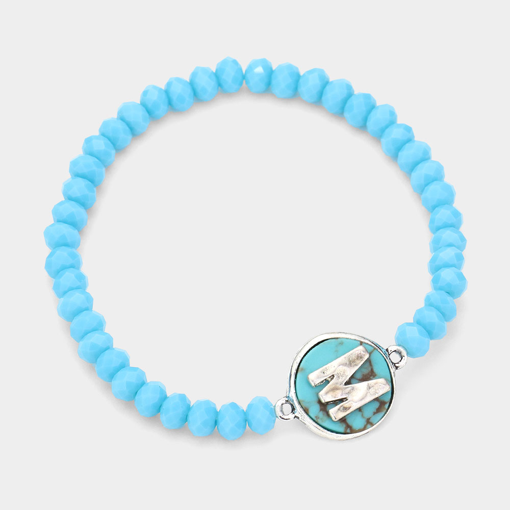 -M- Initial Monogram Turquoise Charm Faceted Beaded Stretch Bracelet