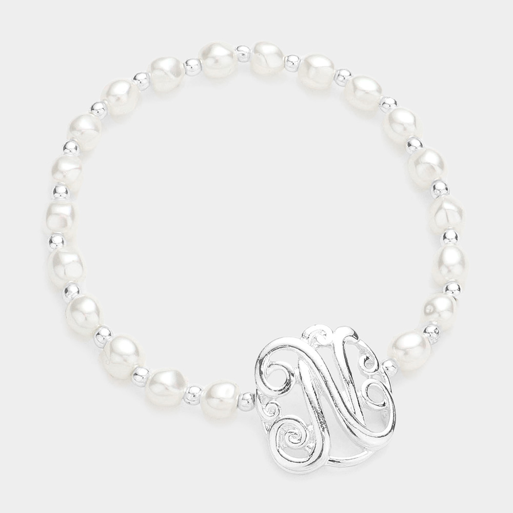 -N- Initial Monogram Charm Pearl Stretch Bracelet