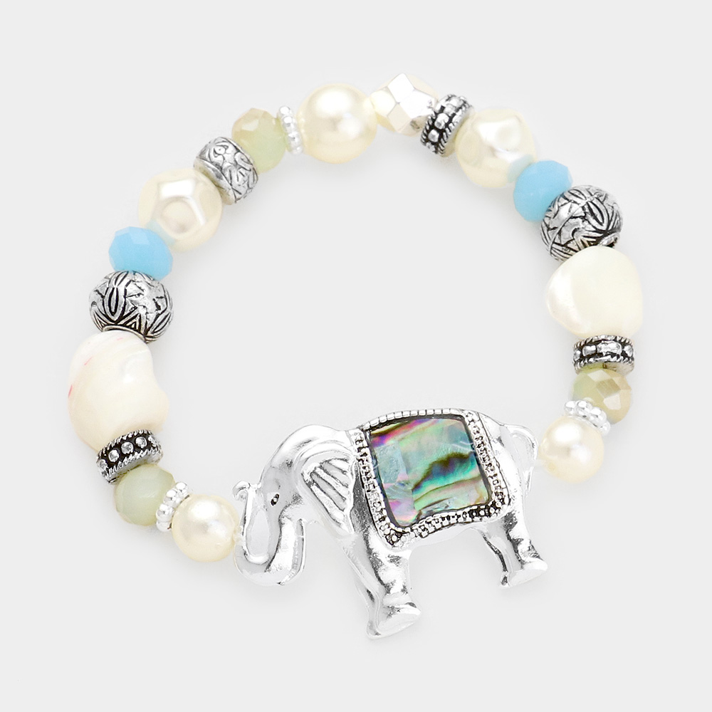 Abalone Antique Sliver Elephant Pearl Multi Beaded Stretch Bracelet