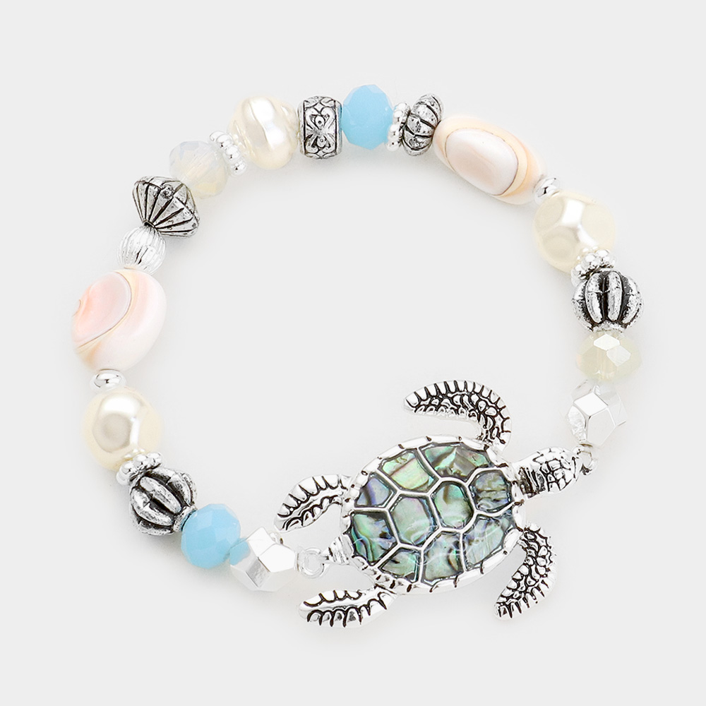Abalone Antique Sliver Turtle Pearl Multi Beaded Stretch Bracelet