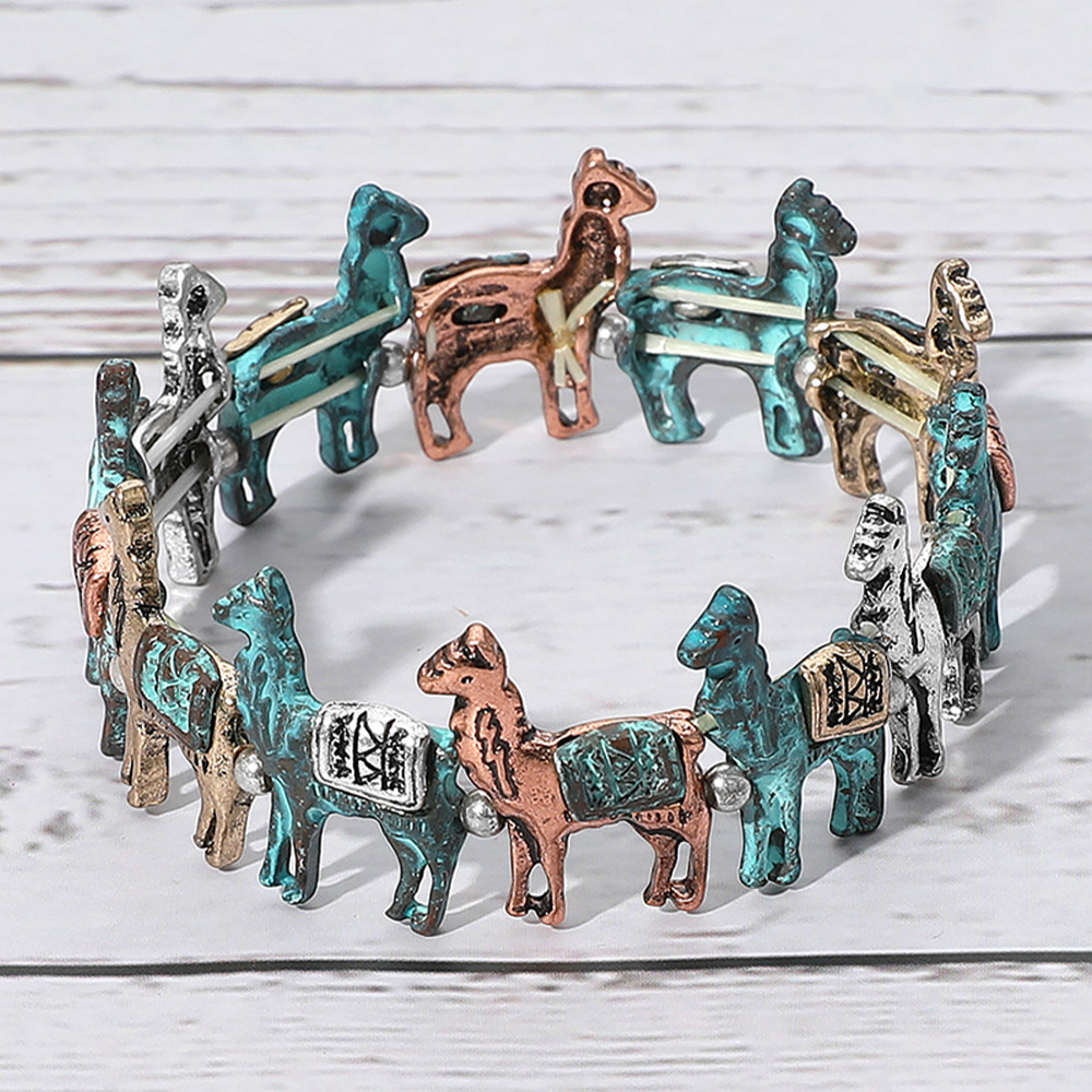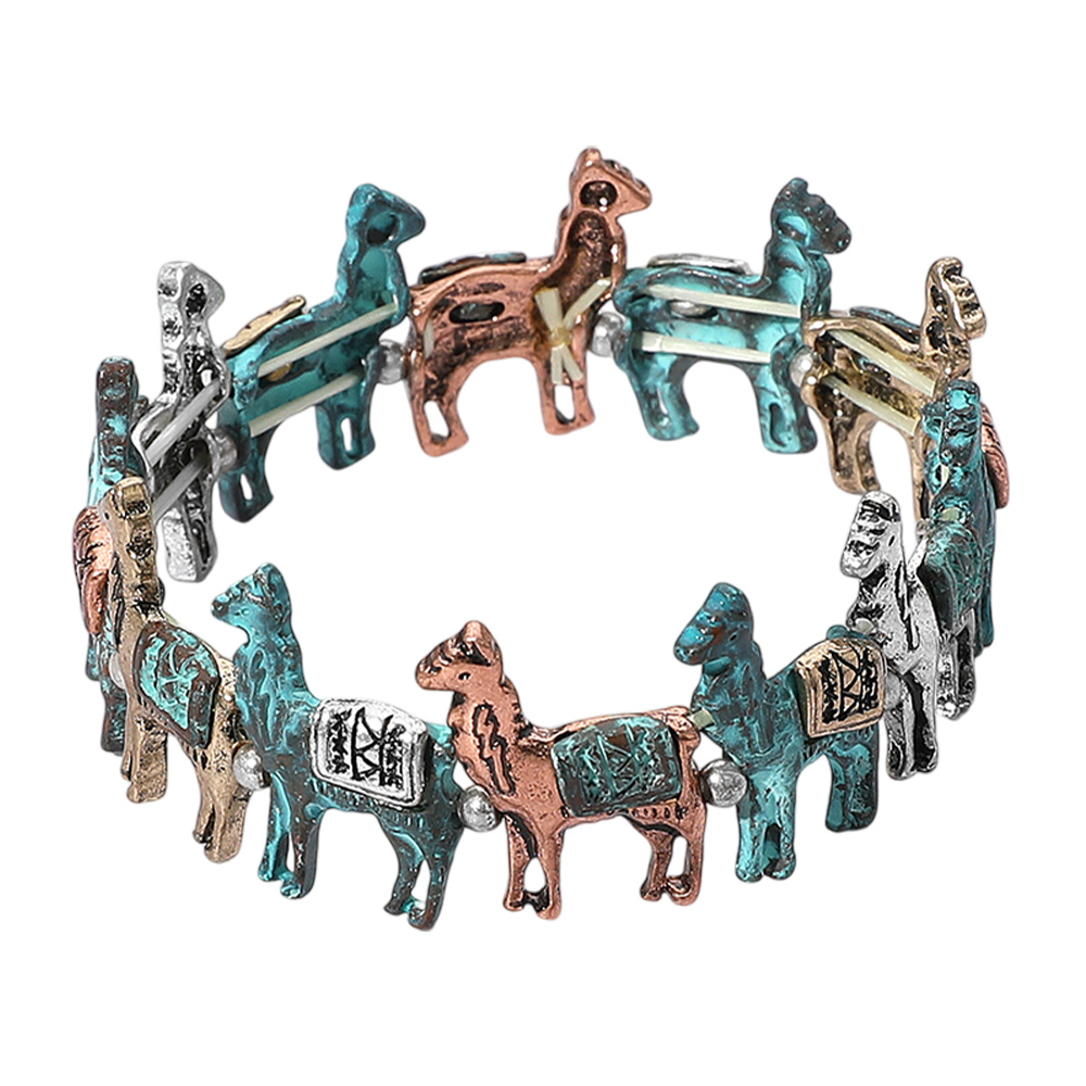 Details • Size : 0.75" H • Stretchable • Stretch bracelet featuring a row of llama-shaped charms with etched tribal designs. Unique mixed-metal finish adds character and charm to this playful piece. Comfortable fit for everyday wear. • Lead and Nickel Compliant