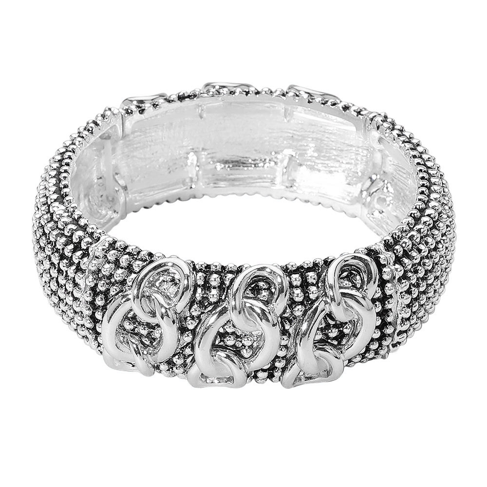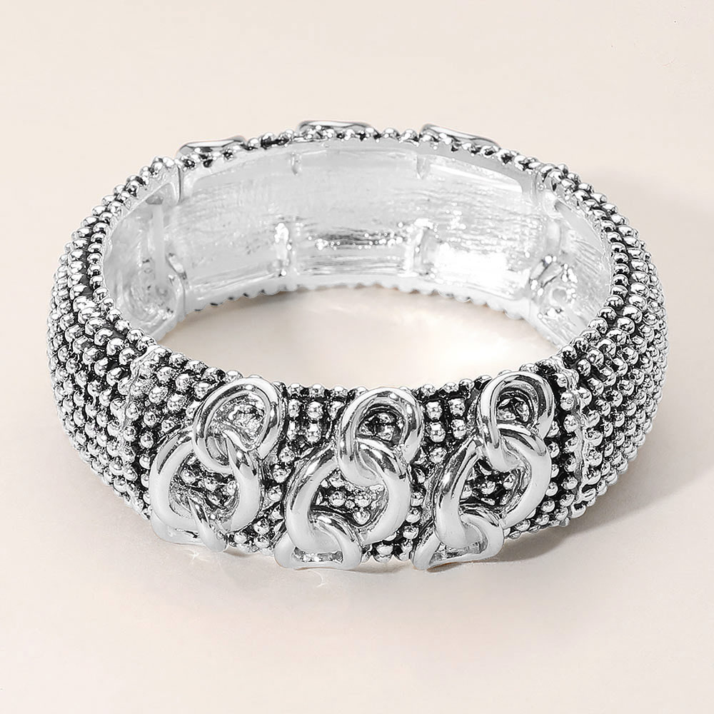 Details • Size : 0.9" H • Stretchable • Bold stretch cuff bracelet featuring a textured beaded design and linked detailing. Adds a statement finish to any outfit with its unique, artistic structure and comfortable fit. Ideal for casual or dressy looks. • Lead and Nickel Compliant