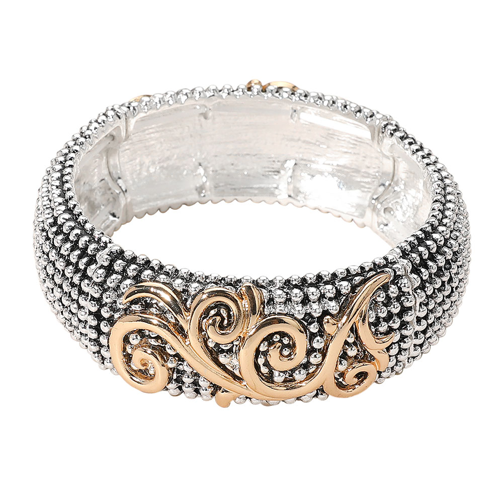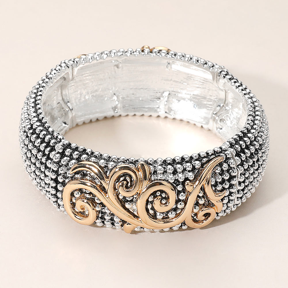 Details • Size : 0.9" H • Stretchable • Elegant stretch bracelet with textured beads and ornate scroll detailing. A stylish, comfortable accessory that effortlessly enhances casual or formal looks. • Lead and Nickel Compliant