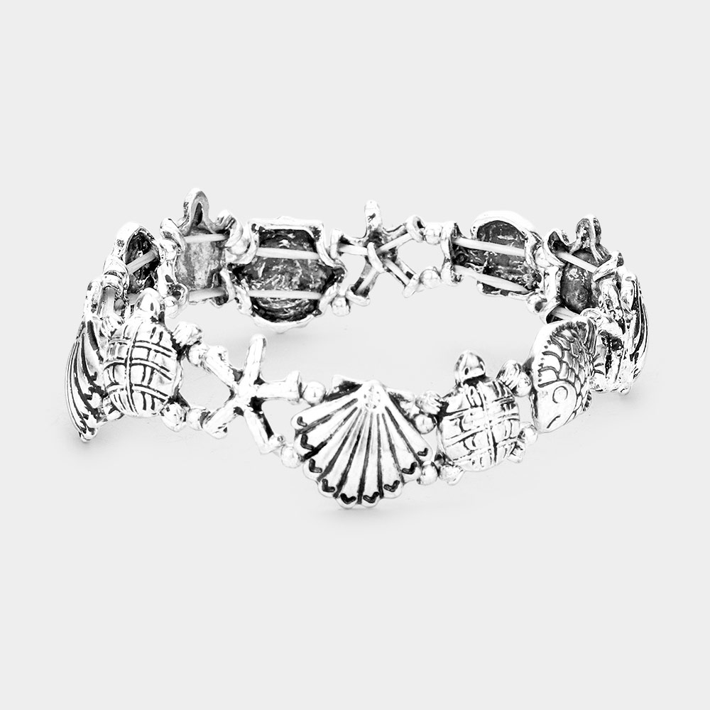 Antique Metal Shell Turtle Fish Starfish Stretch Bracelet