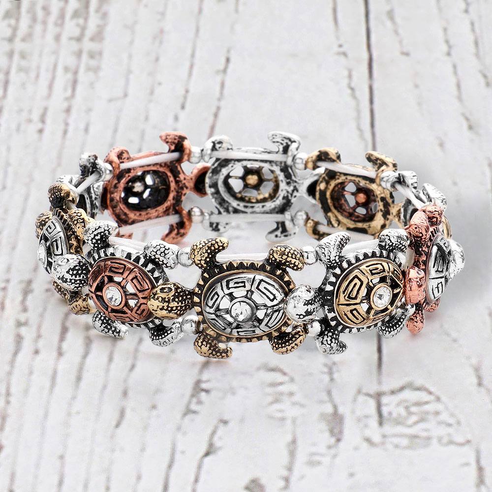 Antique Metal Stone Centered Turtle Link Stretch Bracelet