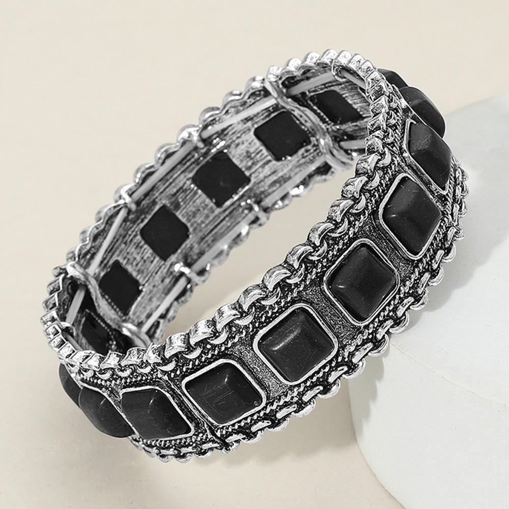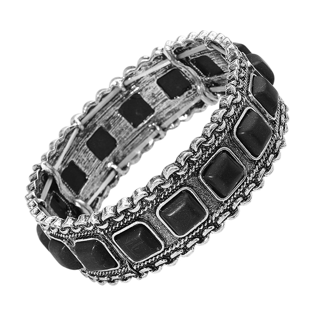 • Bracelet with textured antique finish, featuring square inset stones and braided edge detailing. A bold and elegant accessory that brings vintage flair to both casual and formal looks.