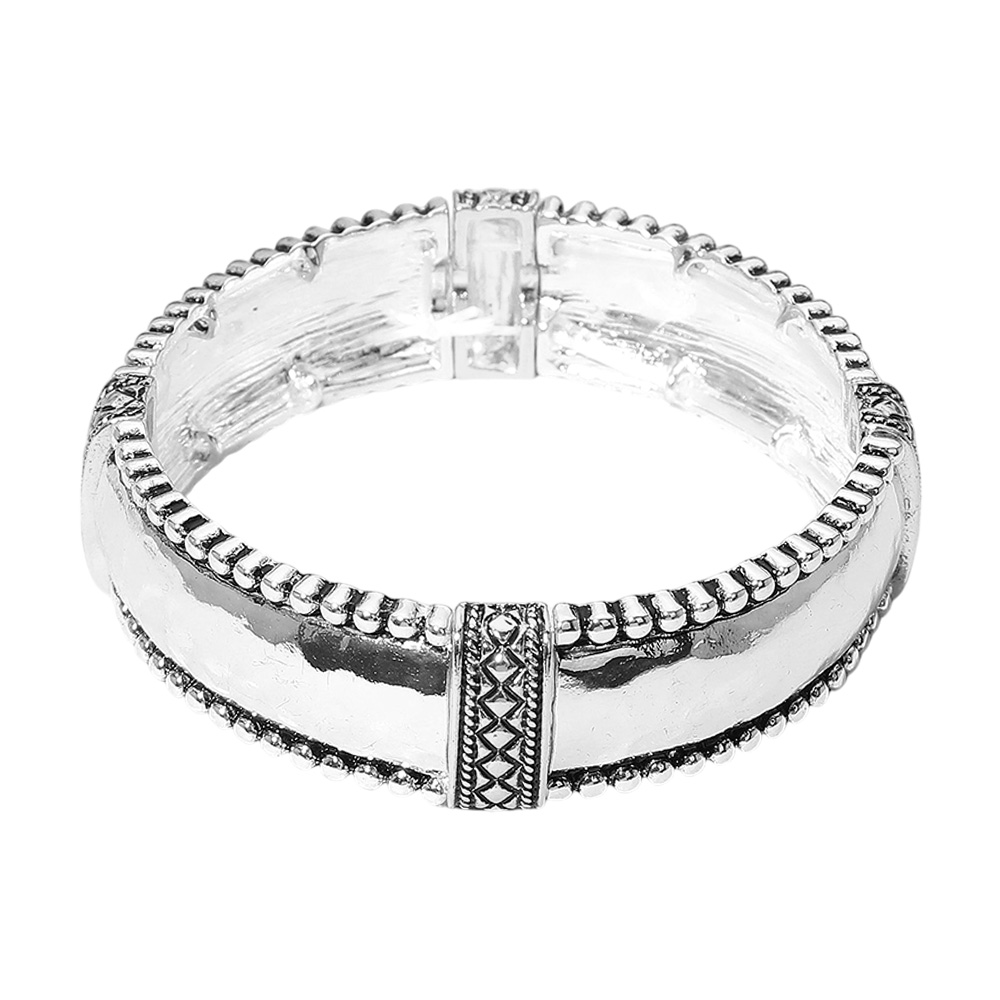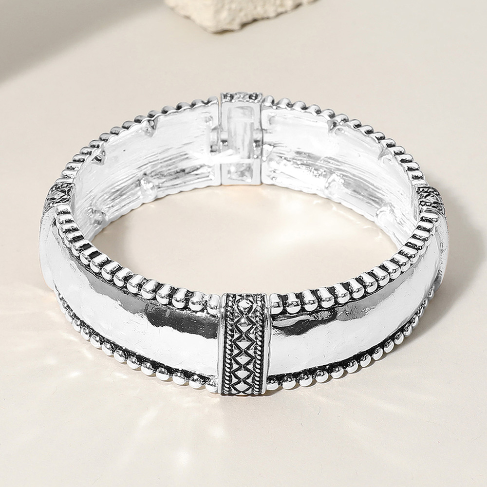 Details • Size : 0.75" H, 2.3" D • Stretchable • This statement bangle showcases a bold, smooth surface framed with intricate beaded edges and detailed accents for a refined finish. Its timeless design and artistic texture create an elegant, eye-catching piece that complements both modern and classic fashion styles effortlessly. • Lead and Nickel Compliant