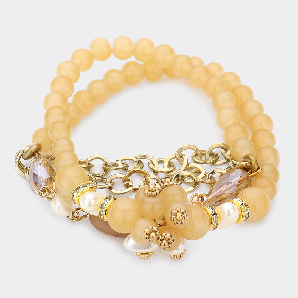 5PCS - Stone Paved Cross Pendant Pointed Faceted Beaded Multi Layered Bracelets