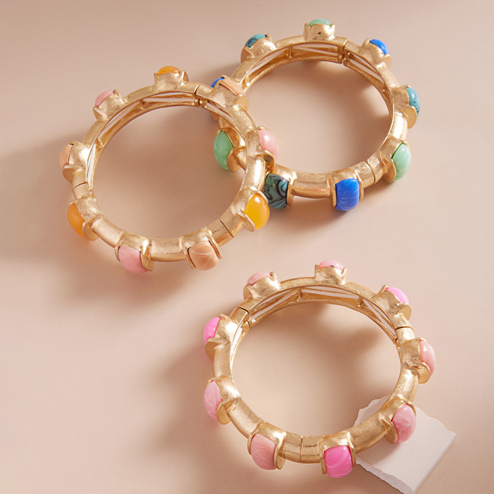 • Bold stretch bracelet featuring a gold-tone frame adorned with polished cabochon-style accents. A modern design with vintage charm, perfect for adding a statement to casual or formal outfits.