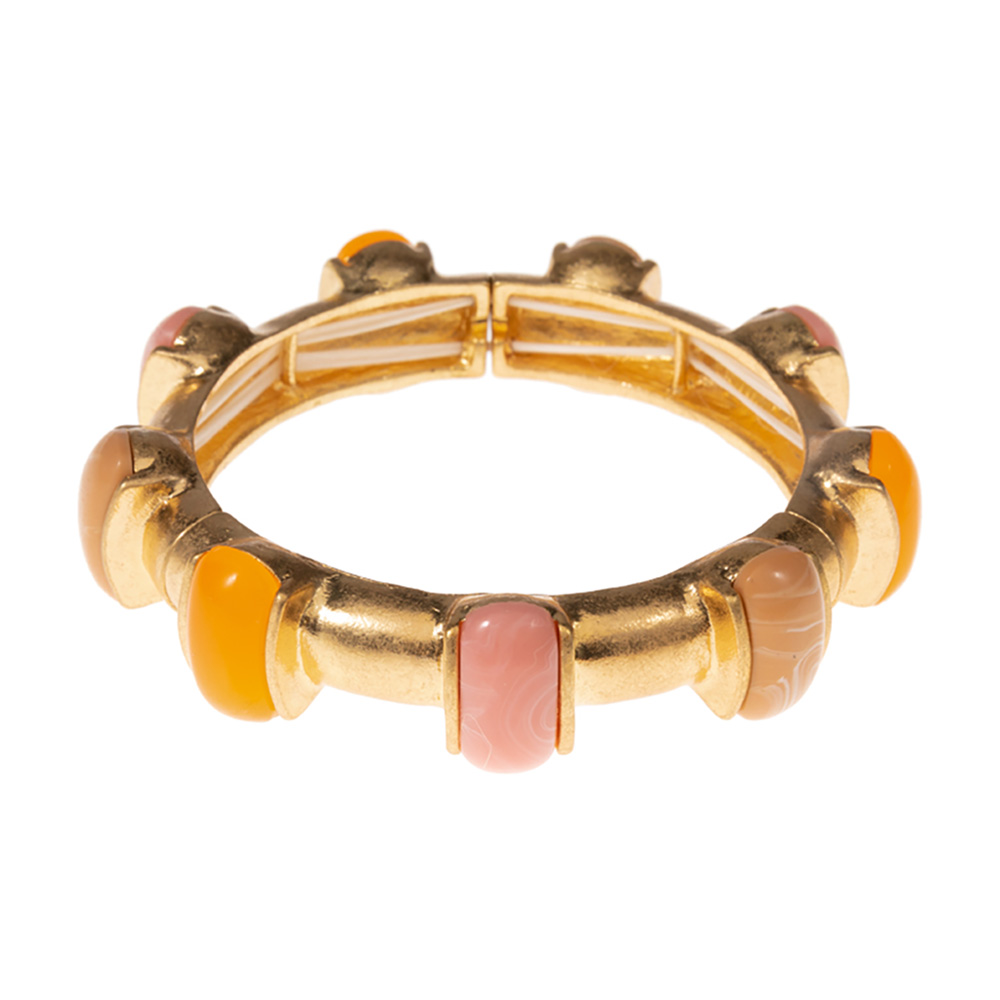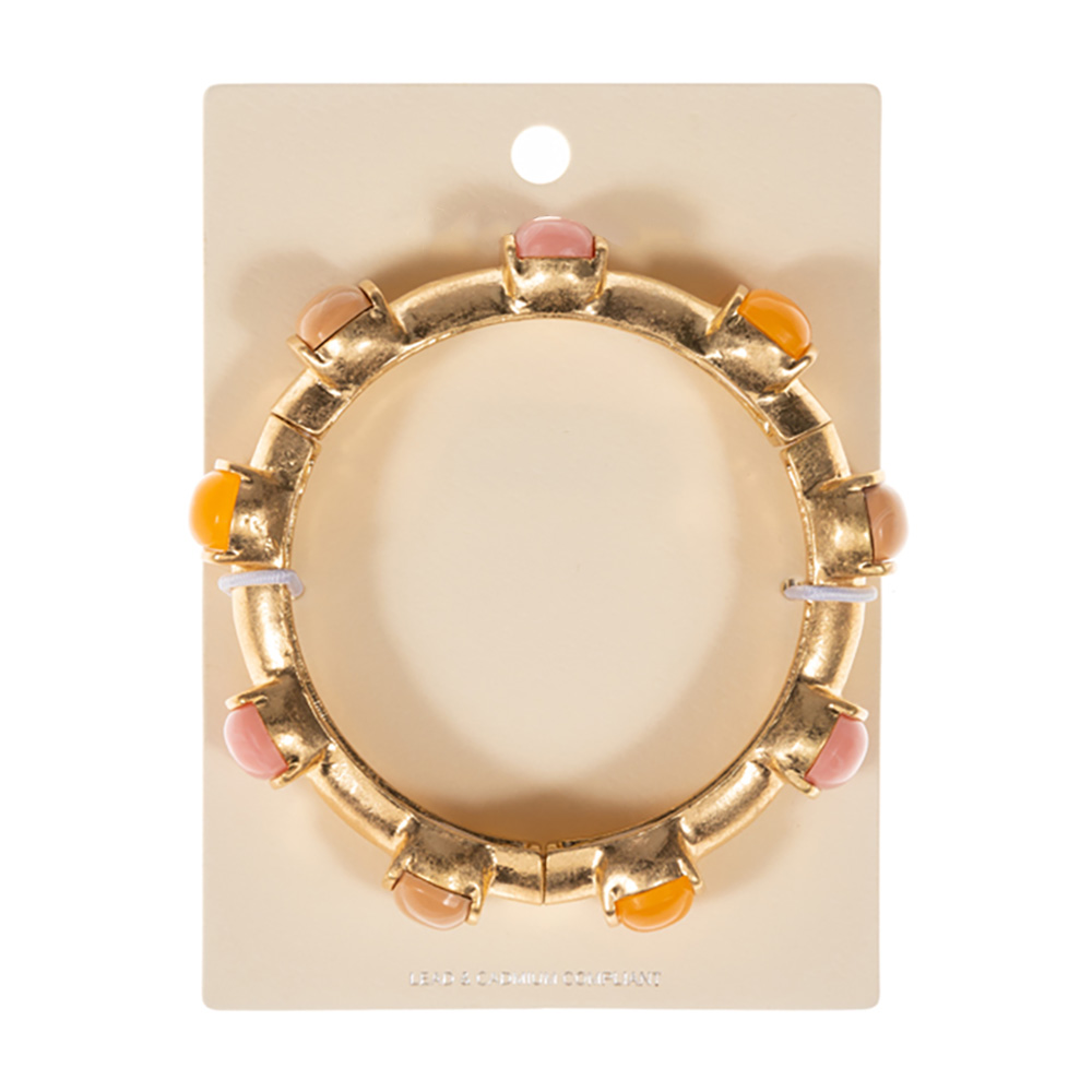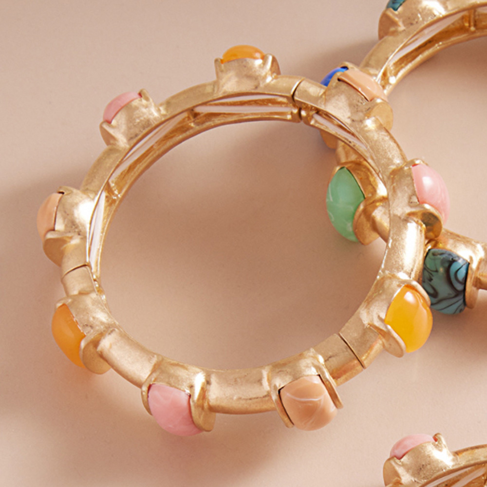 Details • Size : 0.75" H • Stretchable • Bold stretch bracelet featuring a gold-tone frame adorned with polished cabochon-style accents. A modern design with vintage charm, perfect for adding a statement to casual or formal outfits. • Lead and Nickel Compliant