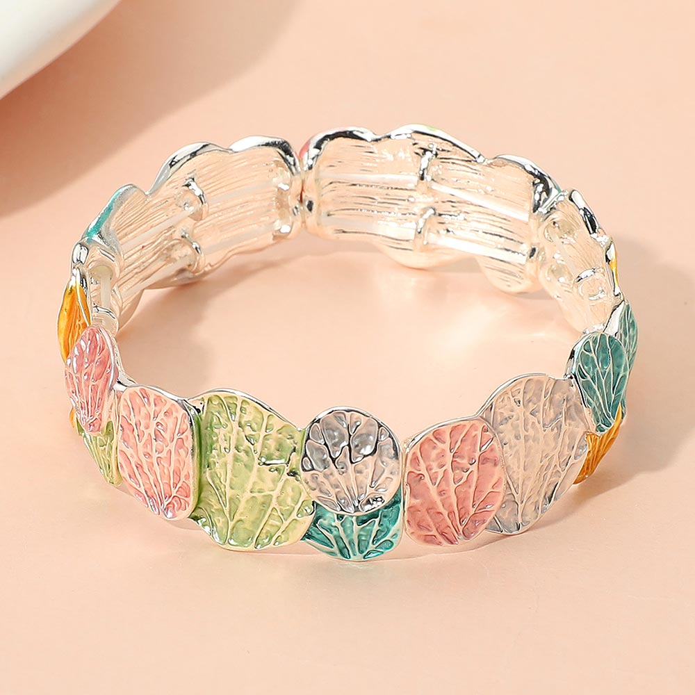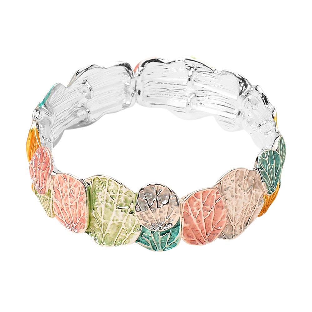 Colored Textured Metal Leaf Motif Stretch Bracelet
