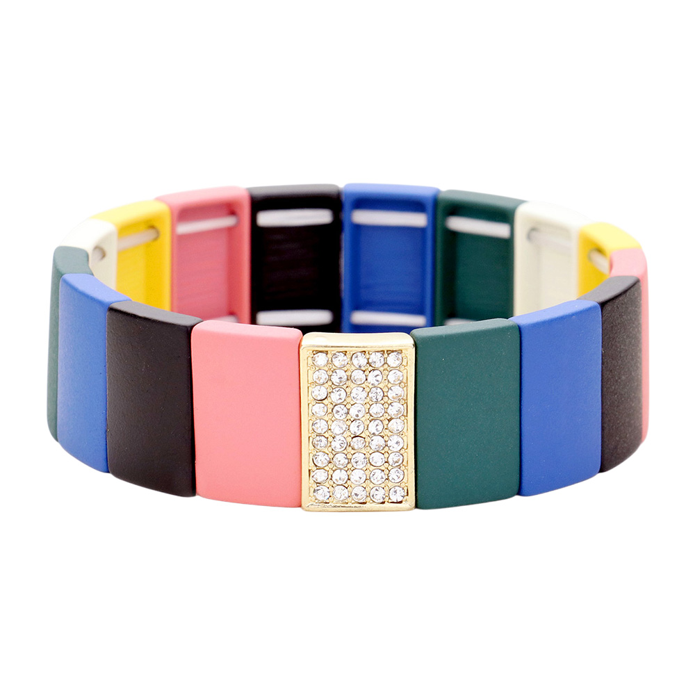 Colorful Wood Rectangle Rhinestone Pave Stretch Bracelet