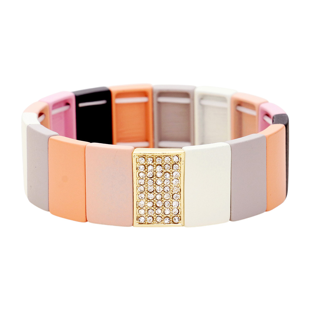 Colorful Wood Rectangle Rhinestone Pave Stretch Bracelet