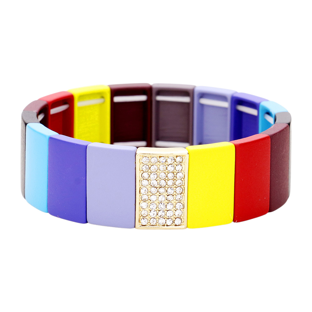 Colorful Wood Rectangle Rhinestone Pave Stretch Bracelet