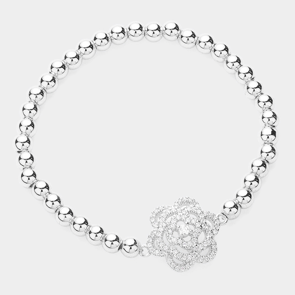 CZ Stone Paved Flower Pointed Stainless Steel Ball Beaded Stretch Bracelet