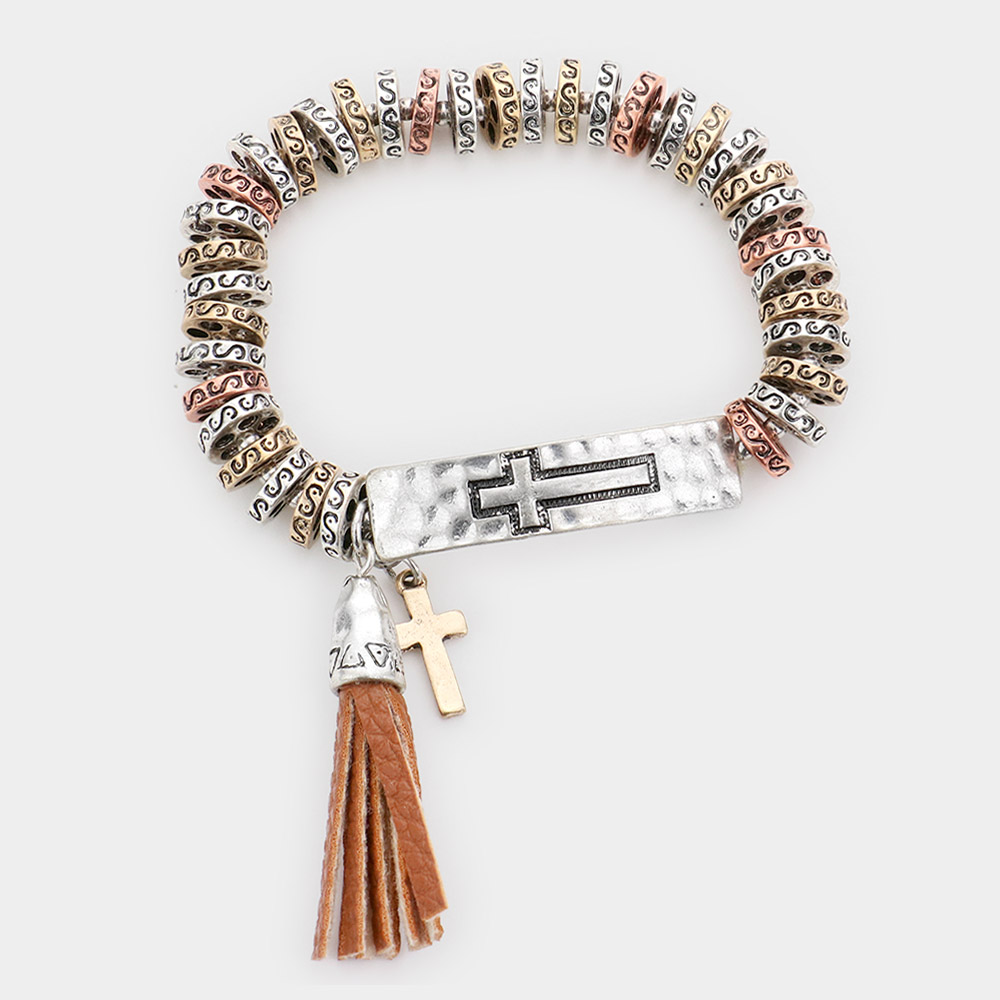 Embossed Cross Metal Bar Faux Leather Tassel Charm Stretch Bracelet