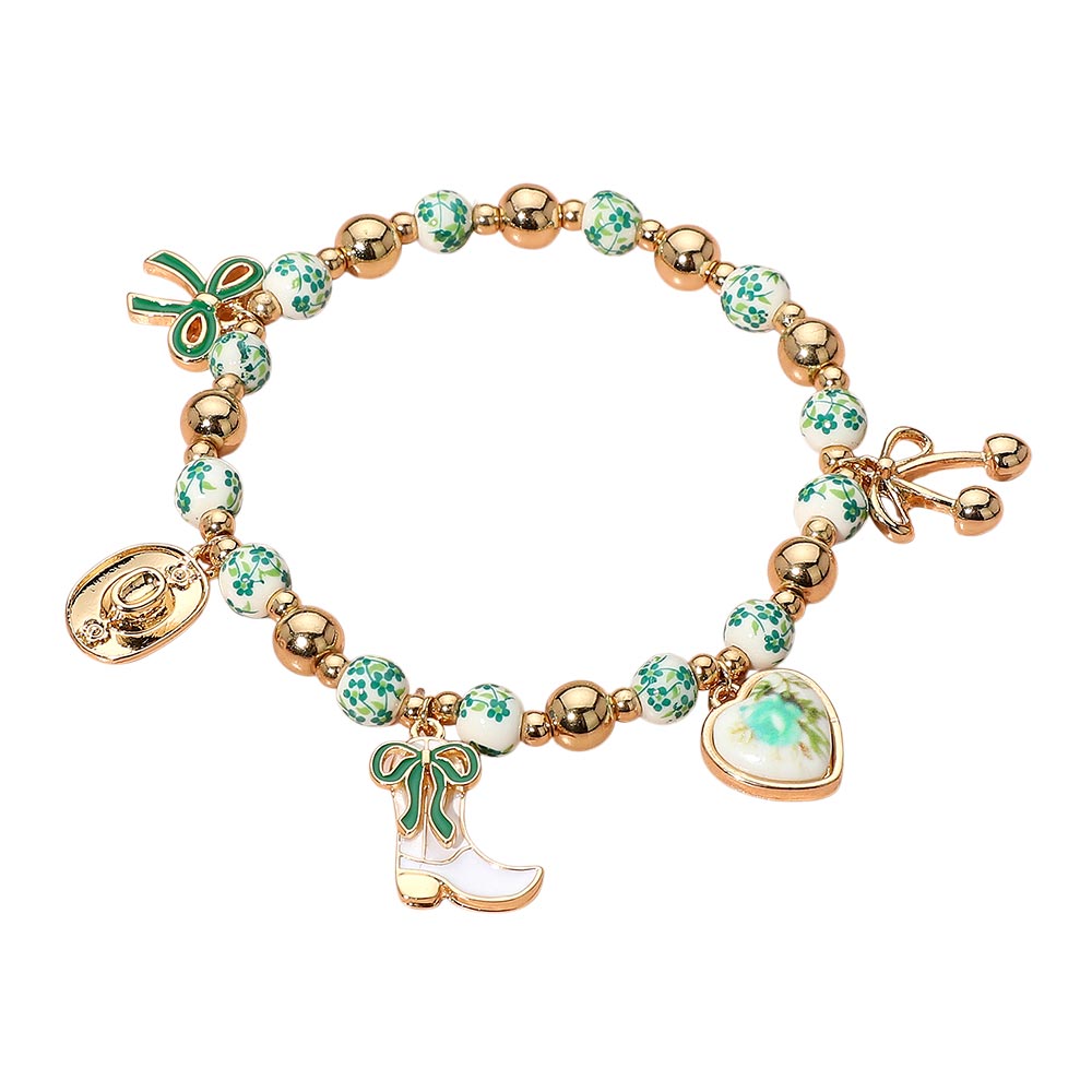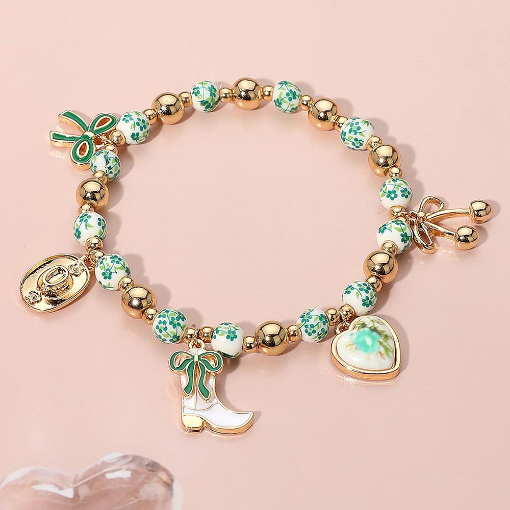 Enamel Bow Western Cowboy Boot Hat Heart Charm Ceramic Ball Beaded Stretch Bracelet